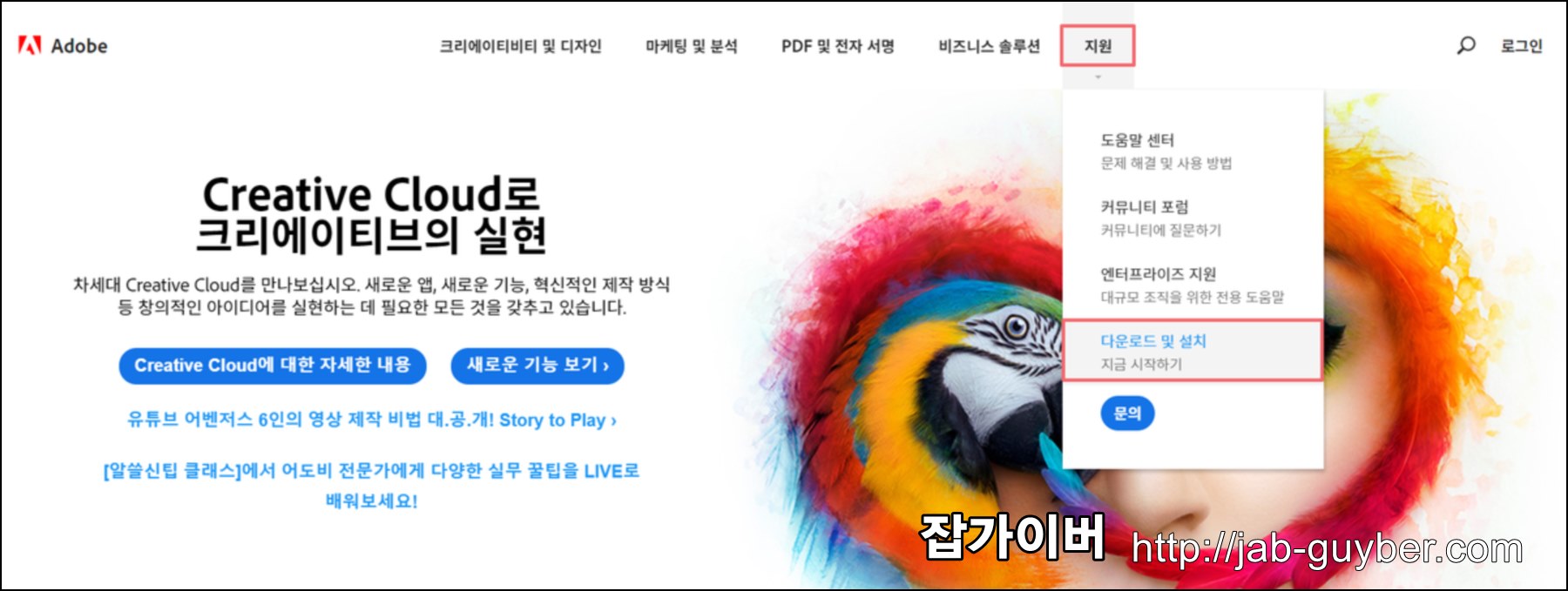 상단의 메뉴 "지원" -> "다운로드 및 설치"를 선택합니다.