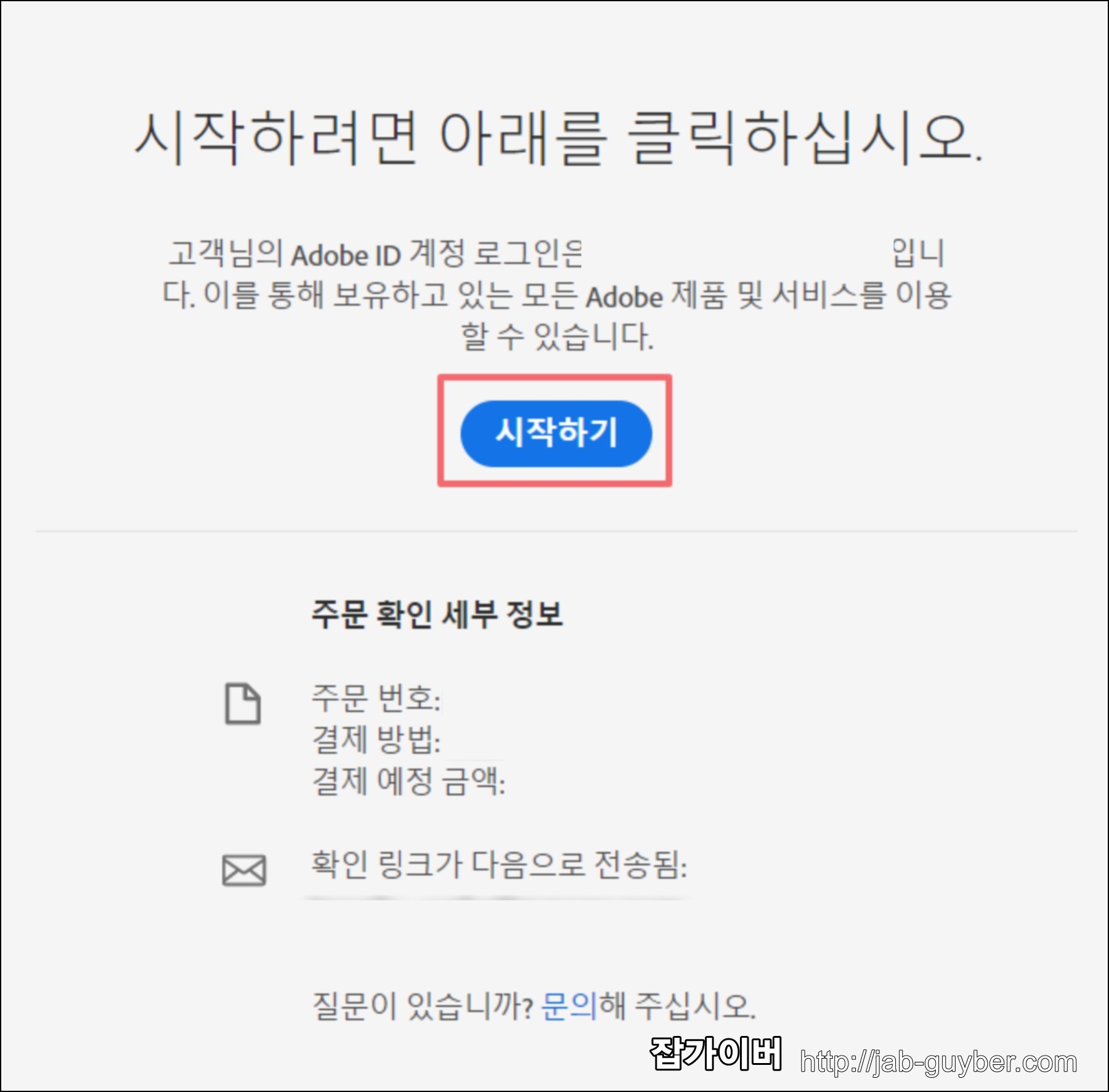 이후 주문번호 및 결제방법, 결제금액을 확인 후 문제가 없다면 "시작하기"를 눌러줍니다.