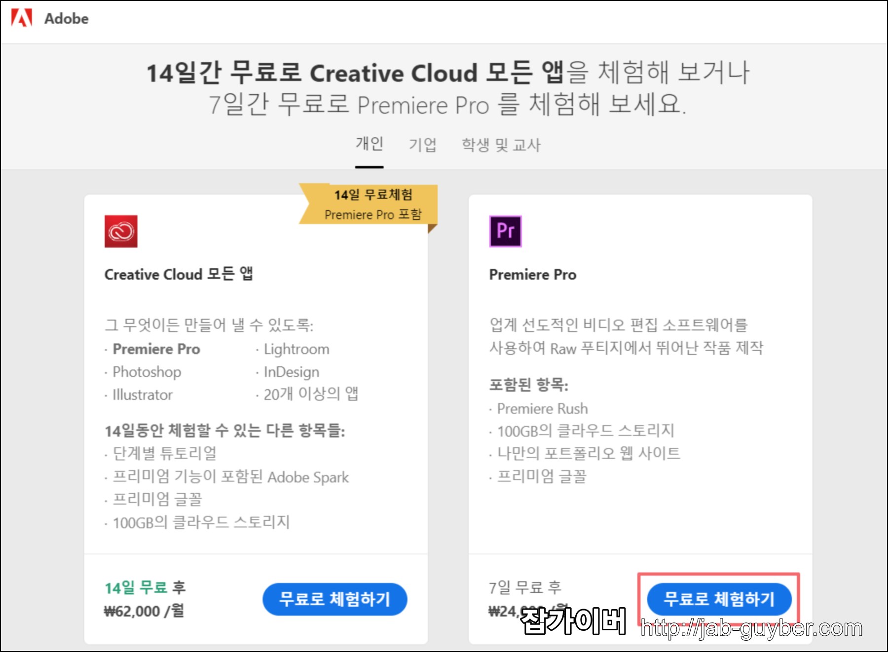 Adobe 사이트에 들어가서 무료 체험판을 다운로드 할 수 있습니다.