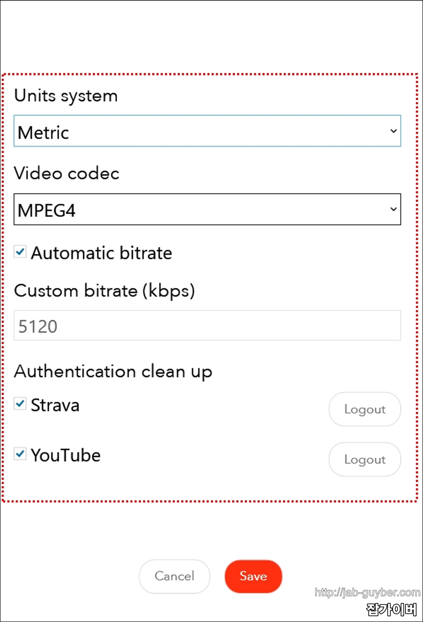 우선 기본적으로 우측 상단의 Setting을 통해 동영상에 삽입할 단위 및 비디오 코덱, 스트라바 및 유튜브 업로드 등을 체크할 수 있습니다.