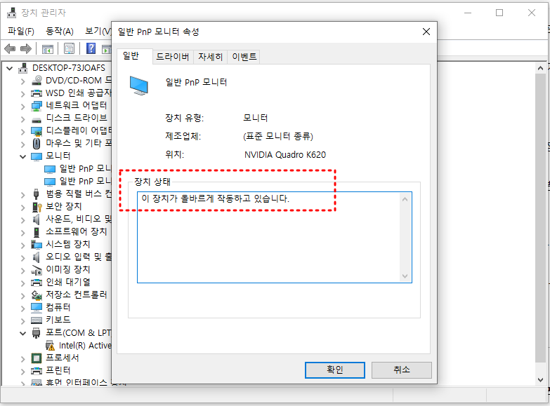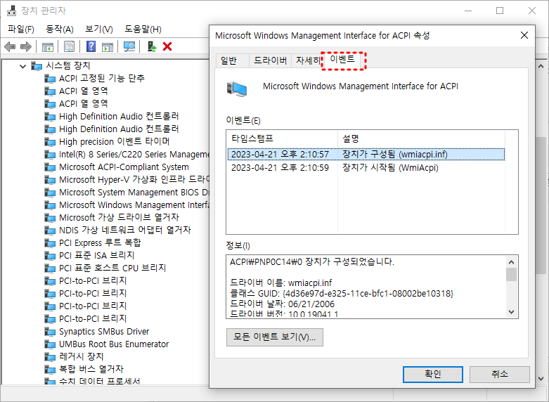 드라이버를 수동으로 설치하거나 문제가 반복될 경우, 장치 관리자에서 장치 속성 → '이벤트' 탭에서 드라이버 설치 로그 및 장치 동작 이력을 확인할 수 있어요.