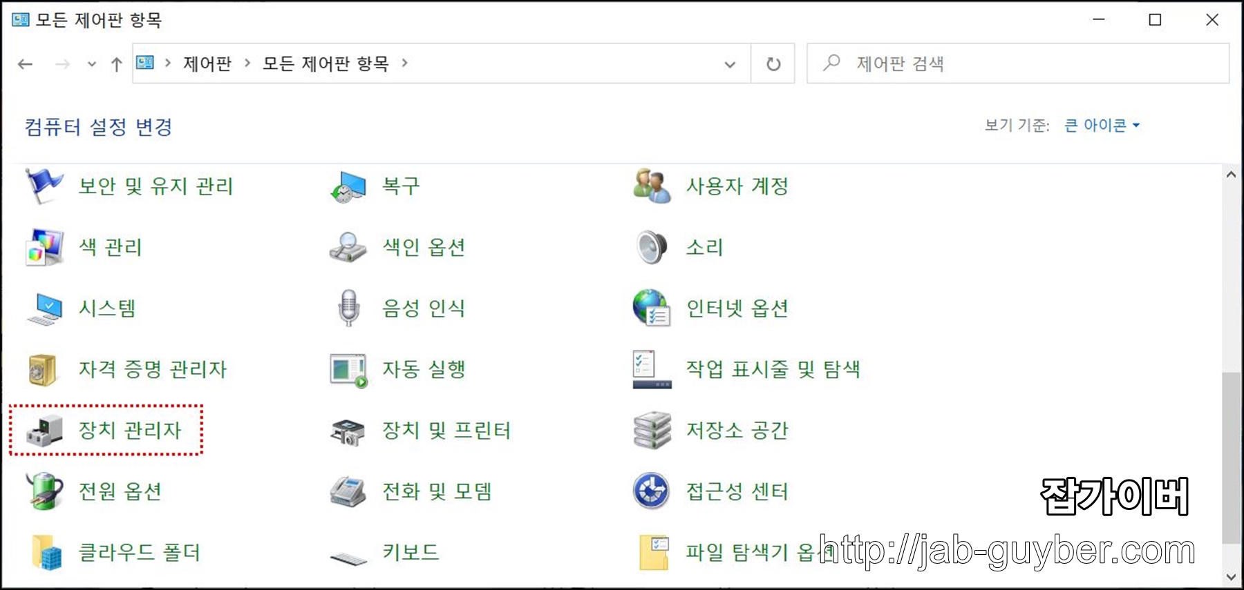 보기 기준을 큰 아이콘으로 변경 후 마우스를 아래로 내리면 "장치관리자"를 찾을 수 있습니다.