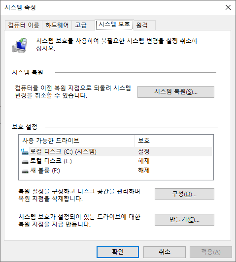 제어판 > 복구 > 시스템 복원 구성 > 복원 설정을 켜고, ‘지금 만들기’를 눌러 복원 지점을 수동 생성해두면 문제가 생겼을 때 빠르게 되돌릴 수 있어요.