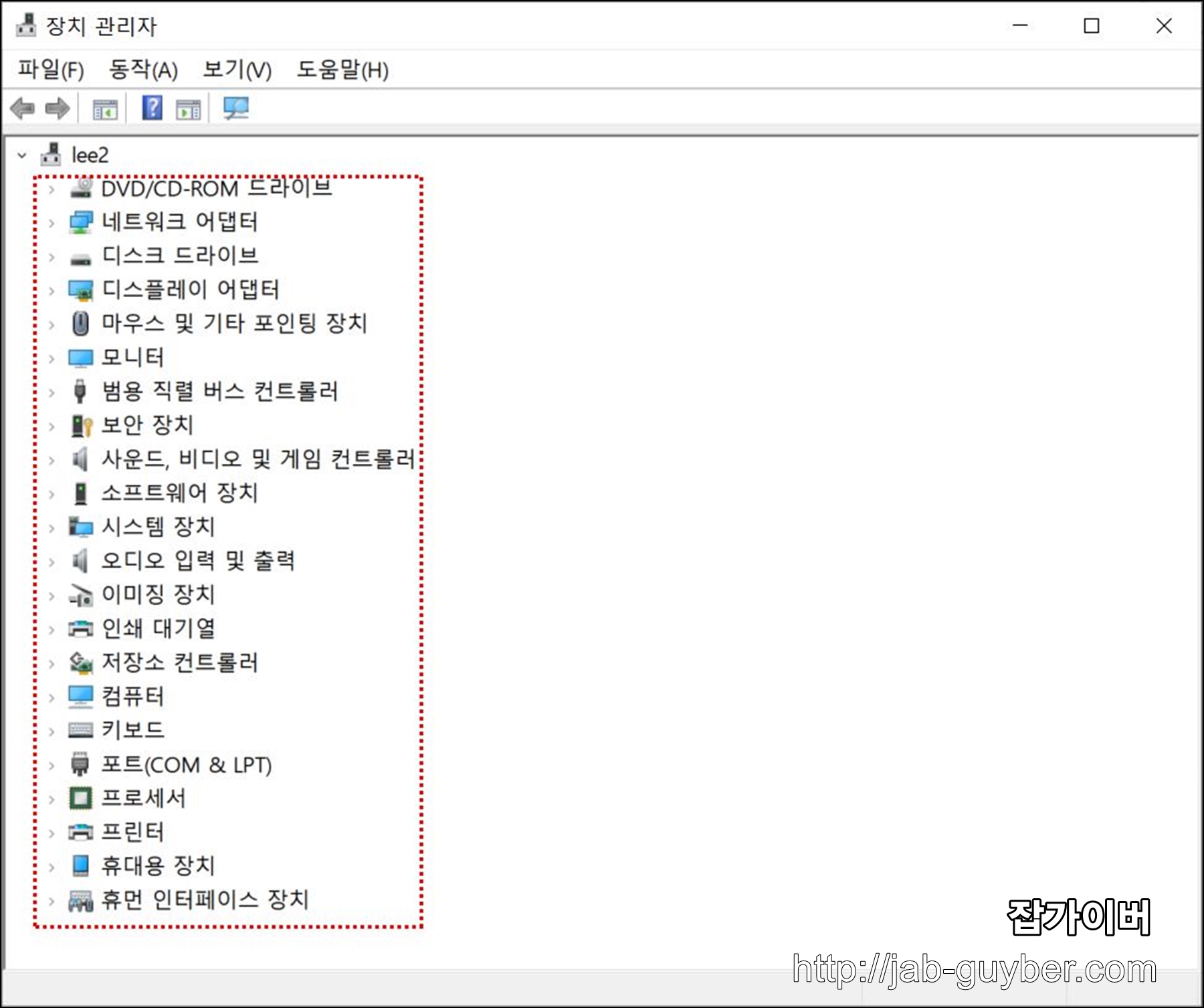 장치 관리자에는 현재 컴퓨터에 장착된 부품들