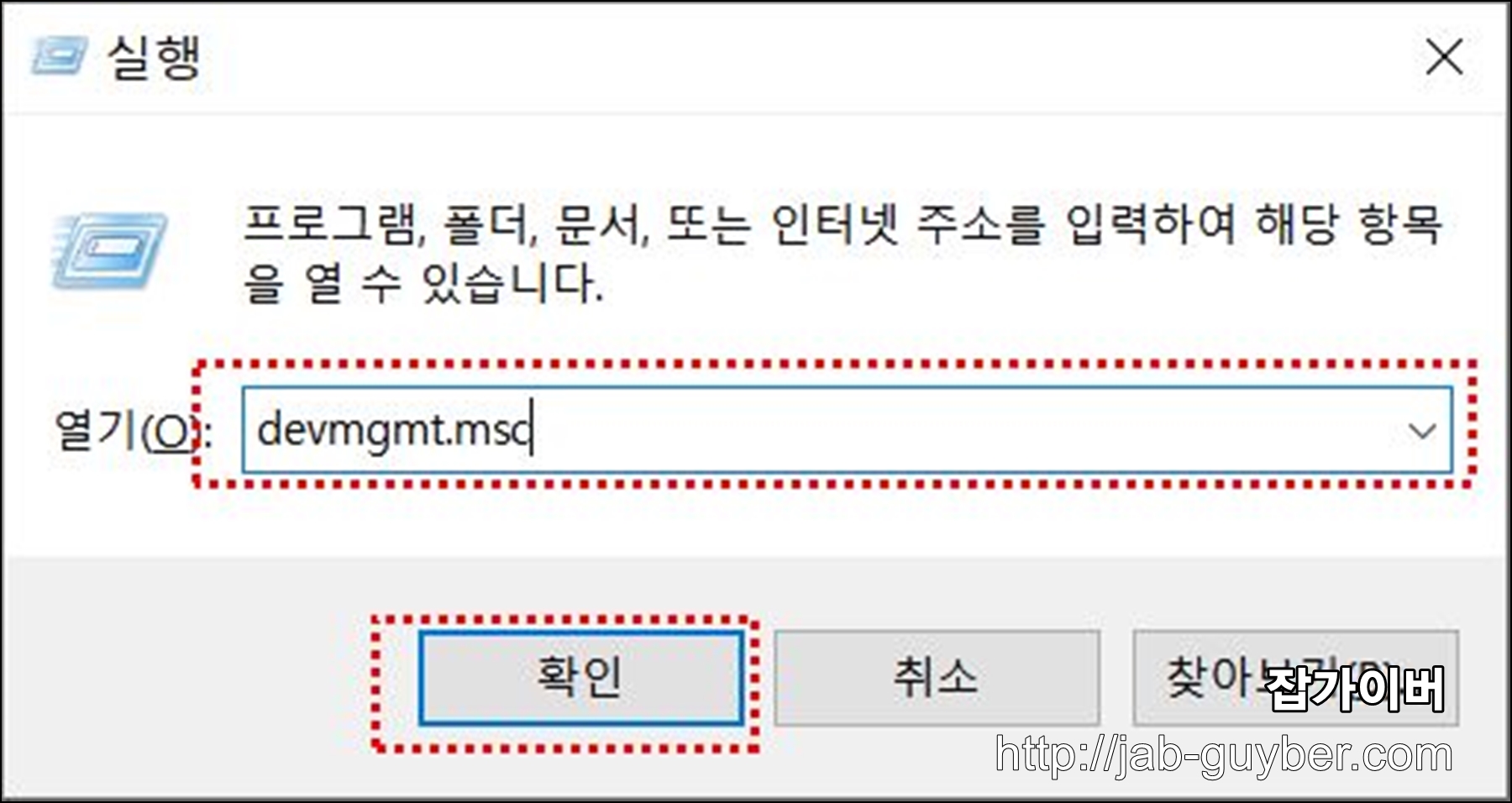 실행창에서 "devmgmt.msc"를 입력 후 확인을 눌러줍니다.
