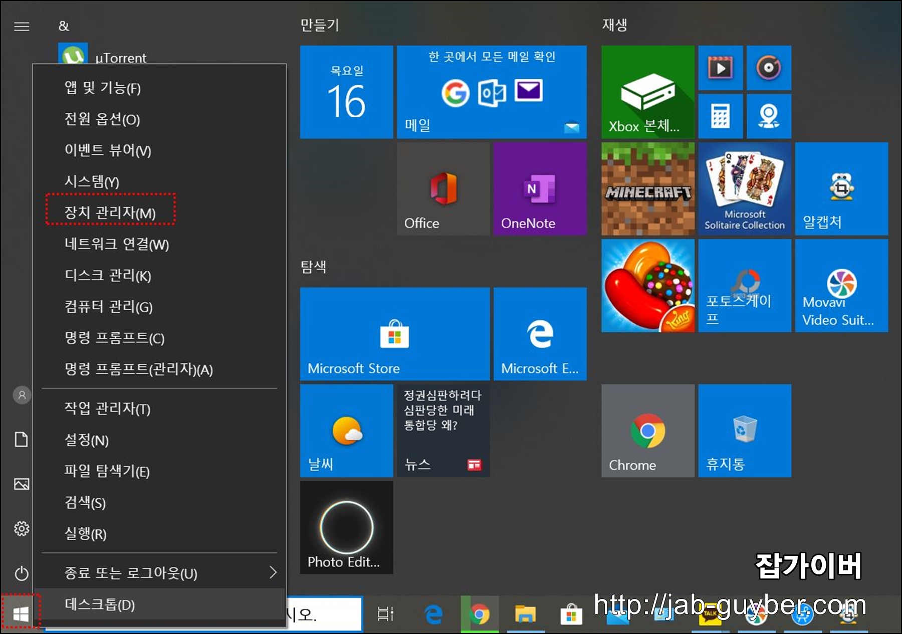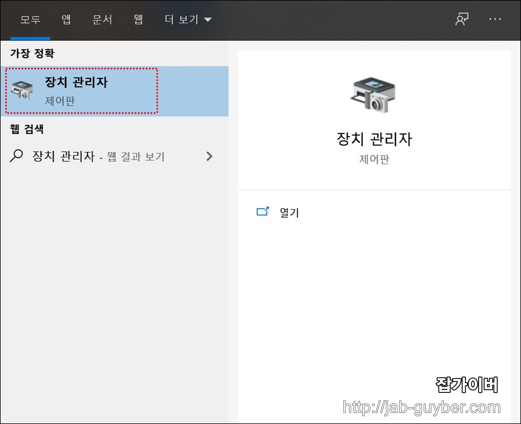 윈도우10에서는 윈도우키를 눌러 검색창에 "장치 관리자"를 검색해서 실행하는게 가장 간단합니다.