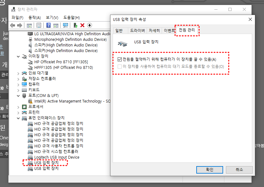 - ‘컴퓨터가 이 장치를 끌 수 있음’ 체크 해제