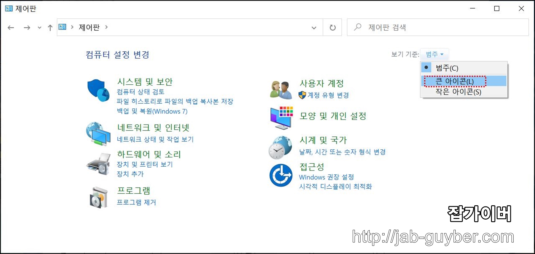 일반 윈도우10 버전에서는 "범주"하면에서는 컴퓨터 설정 변경에서 제어판을 찾기가 쉽지 않습니다.
