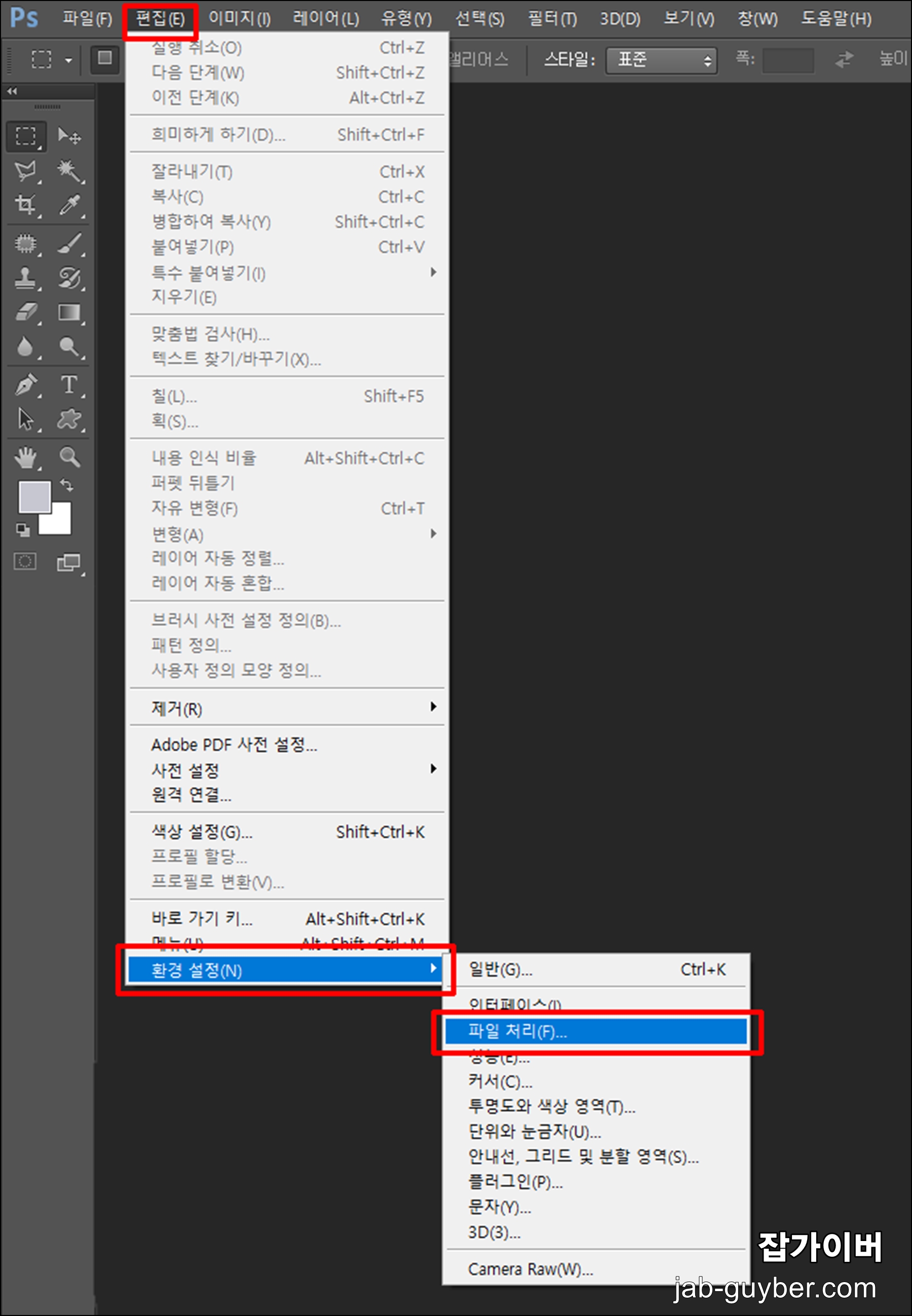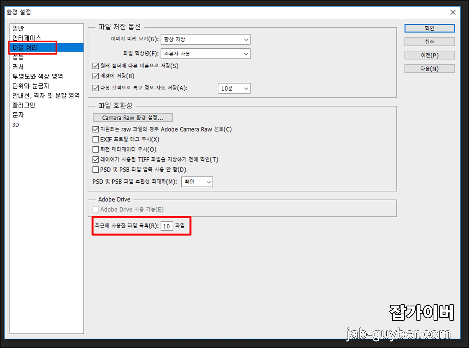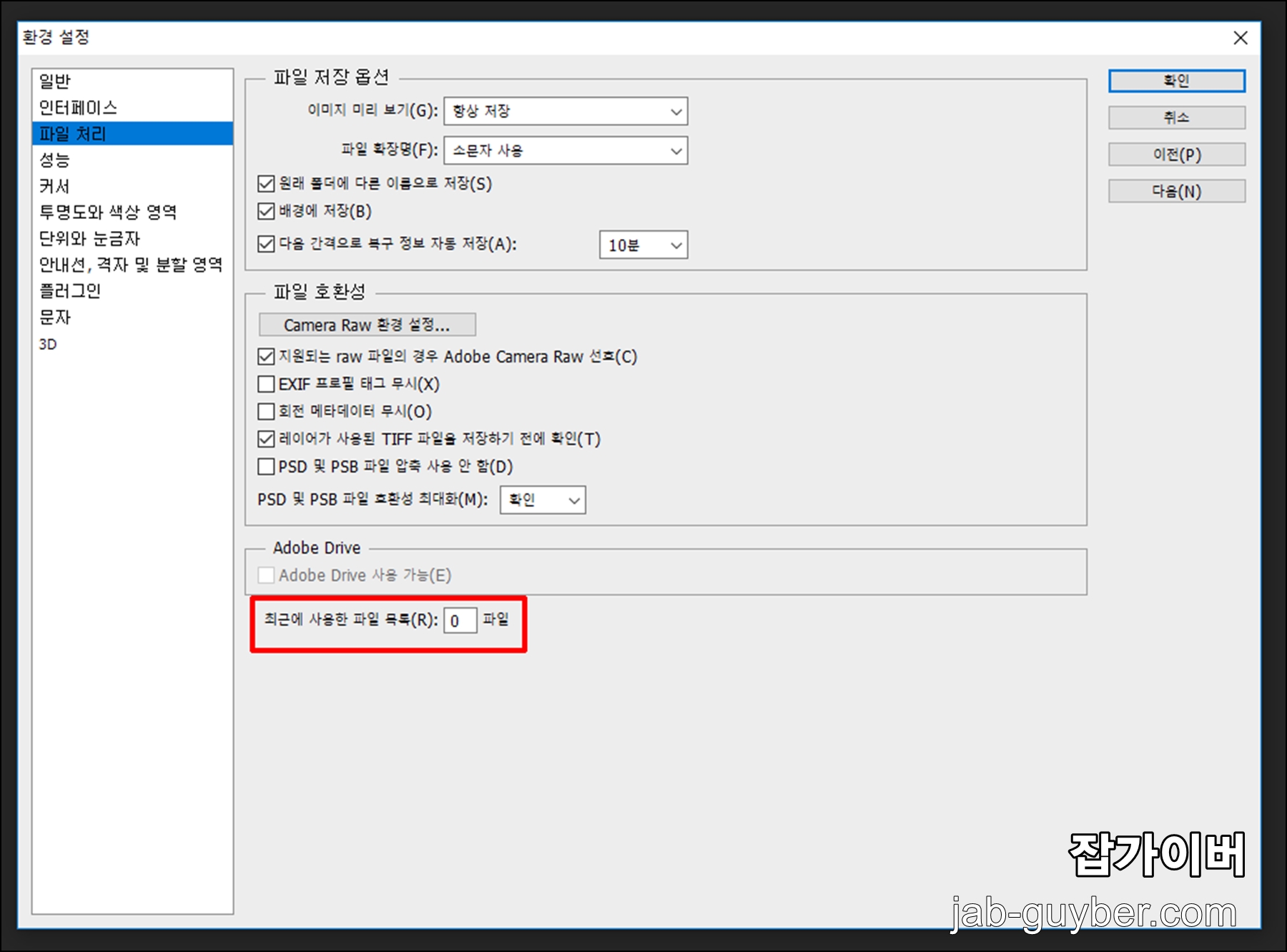 편집 -> 환경설정 -> 파일처리 항목을 선택합니다.