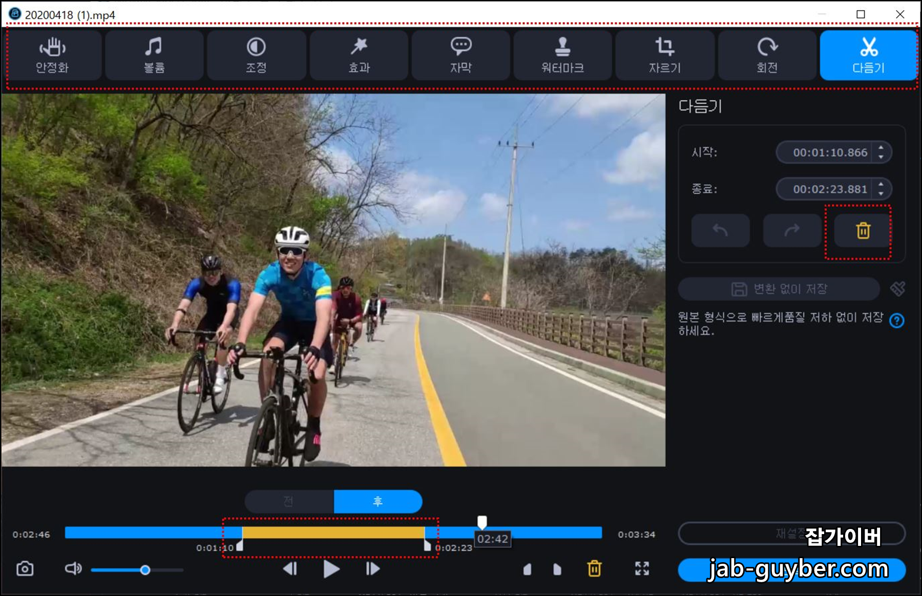특히 움짤을 만들 때 촬영한 영상에 필요 없는 영상을 잘라낸 다음 바로 gif 움짤 파일로 저장할 수 있는 장점이 있습니다.