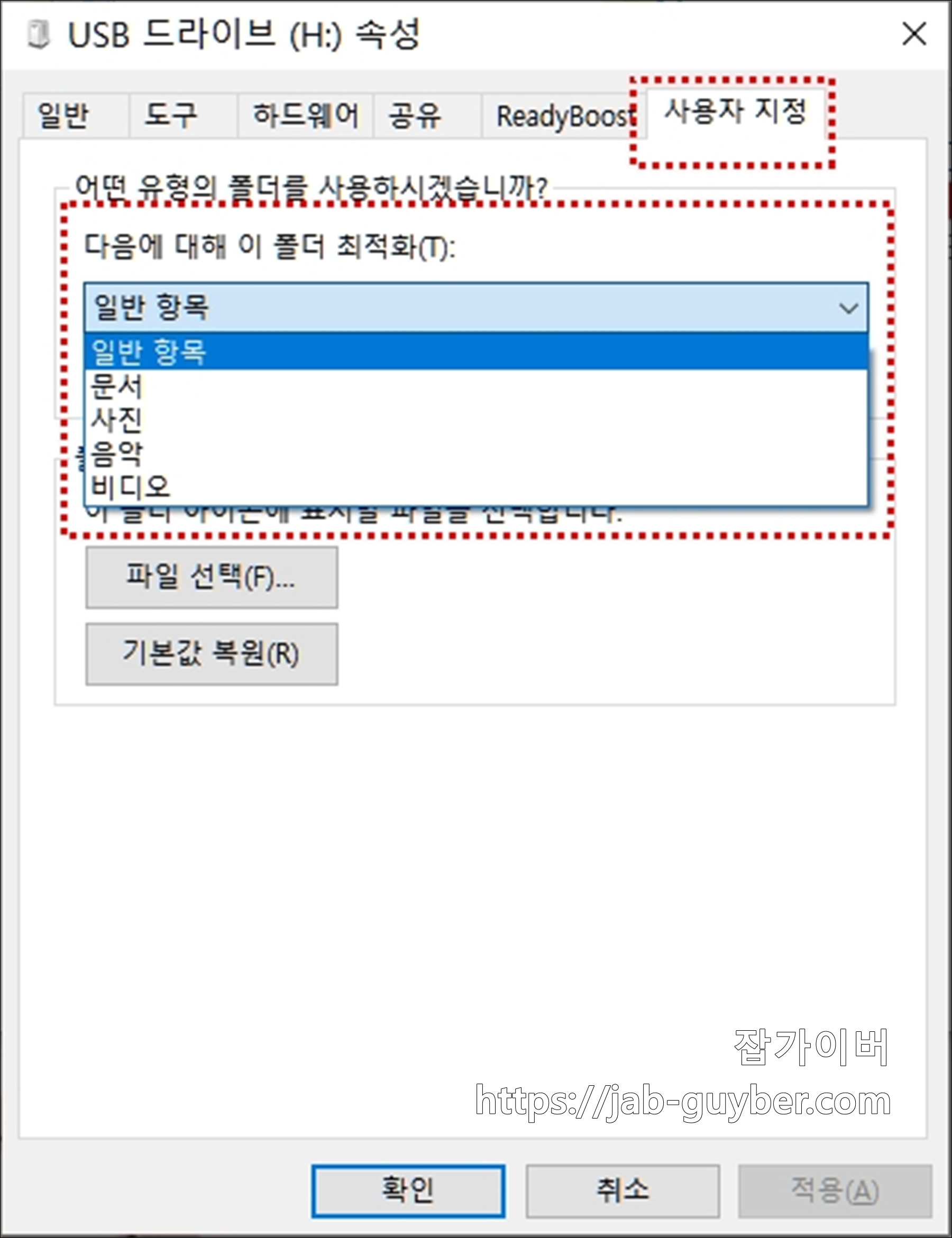 속성의 사용자 지정 탭에 보이는 문서, 사진, 음악, 비디오 같은 항목은 저장장치 사용 형태를 분류하는 정도로 보면 됩니다. 이걸 바꾼다고 체감 속도가 크게 뛰는 수준은 아닙니다.