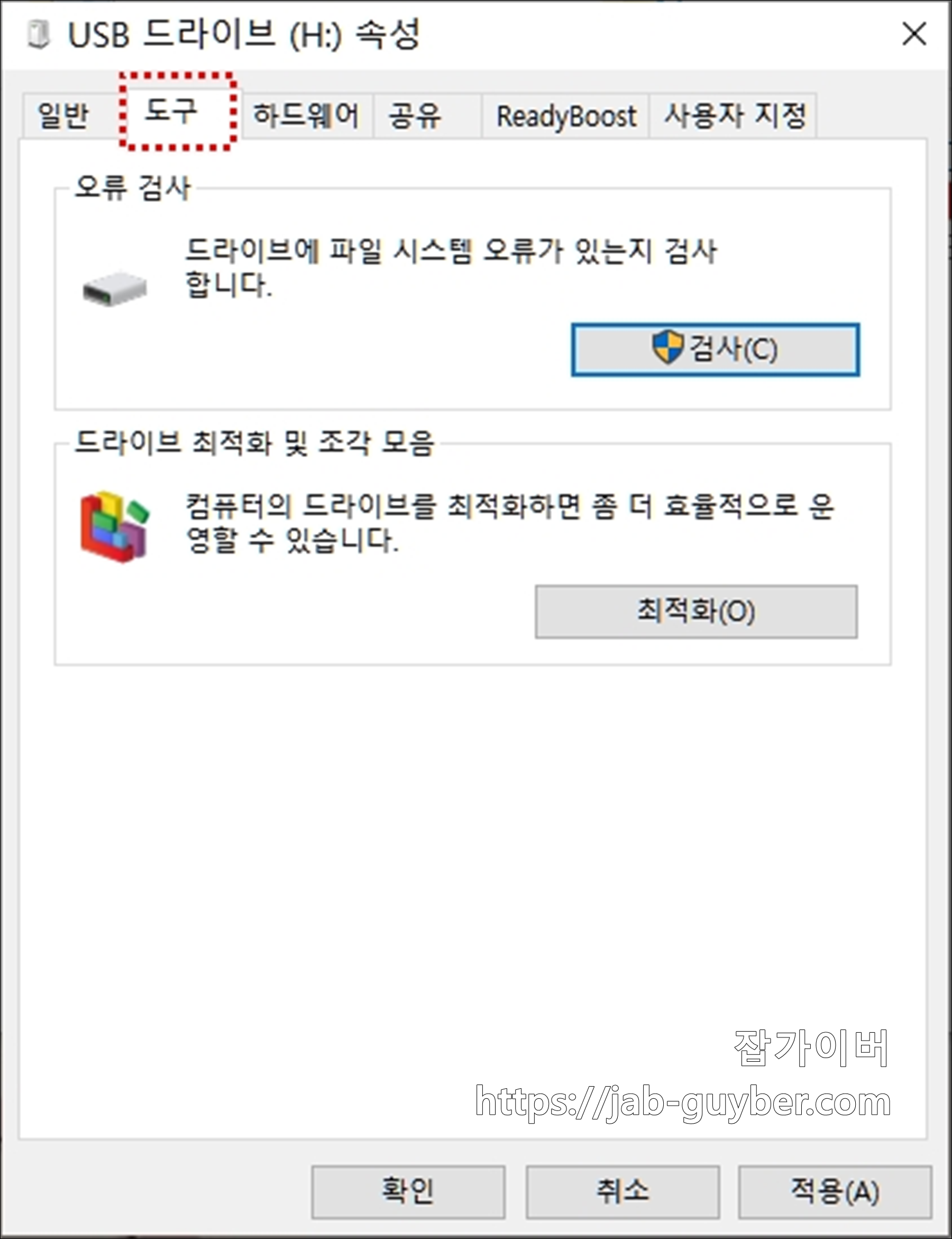 속성으로 들어가면 오류 검사 및 드라이브 최적화 및 조각모음이 가능합니다.