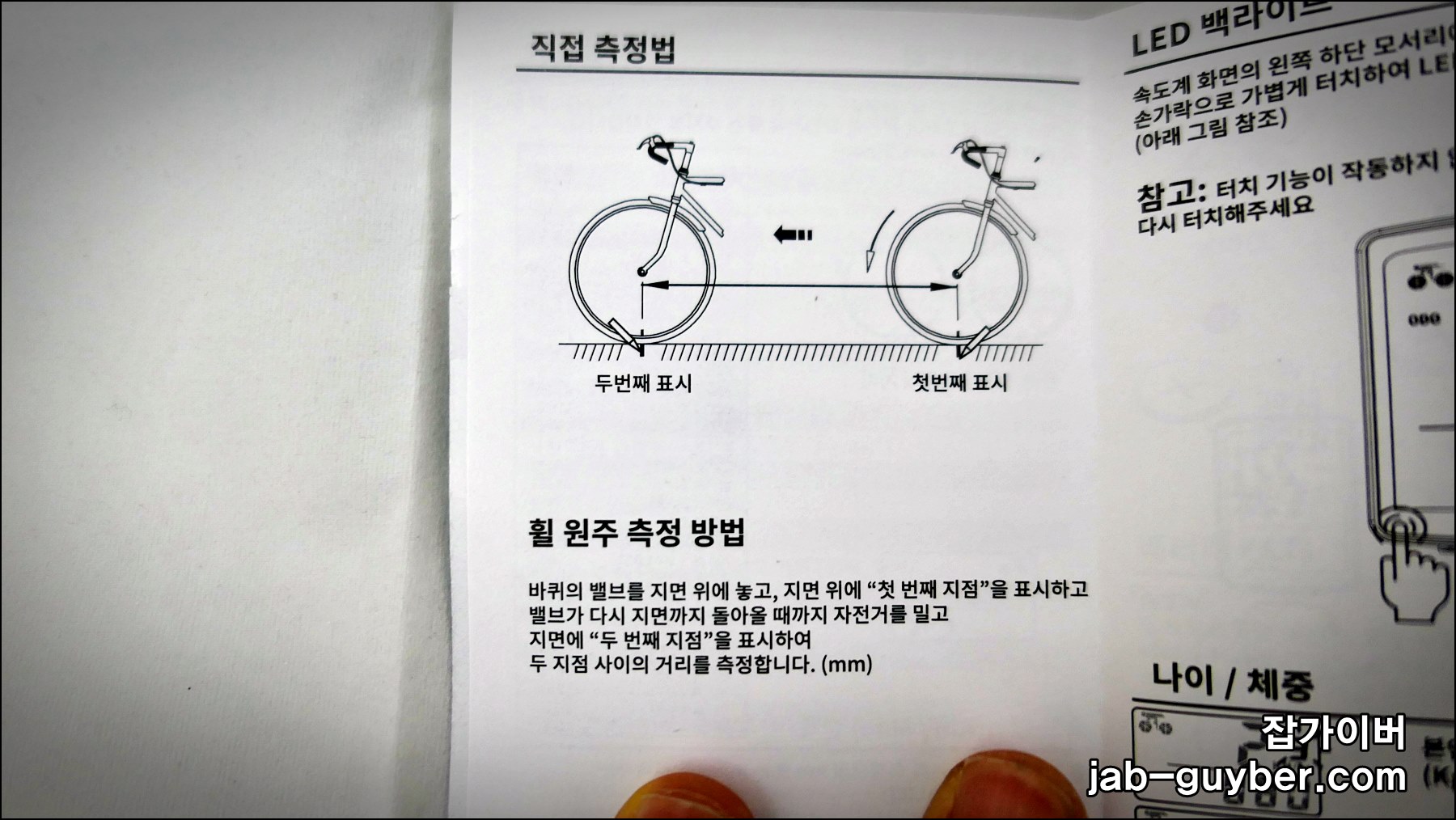 바퀴의 밸브를 지면 위에 놓고 지면 위에 첫번째 지점을 표시하고 밸브에 다시 지면까지 돌아올때까지 자전거를 밁 ㅗ지면에 두번째 지점을 표시하여 두지점 사이의 거리를 측정합니다.