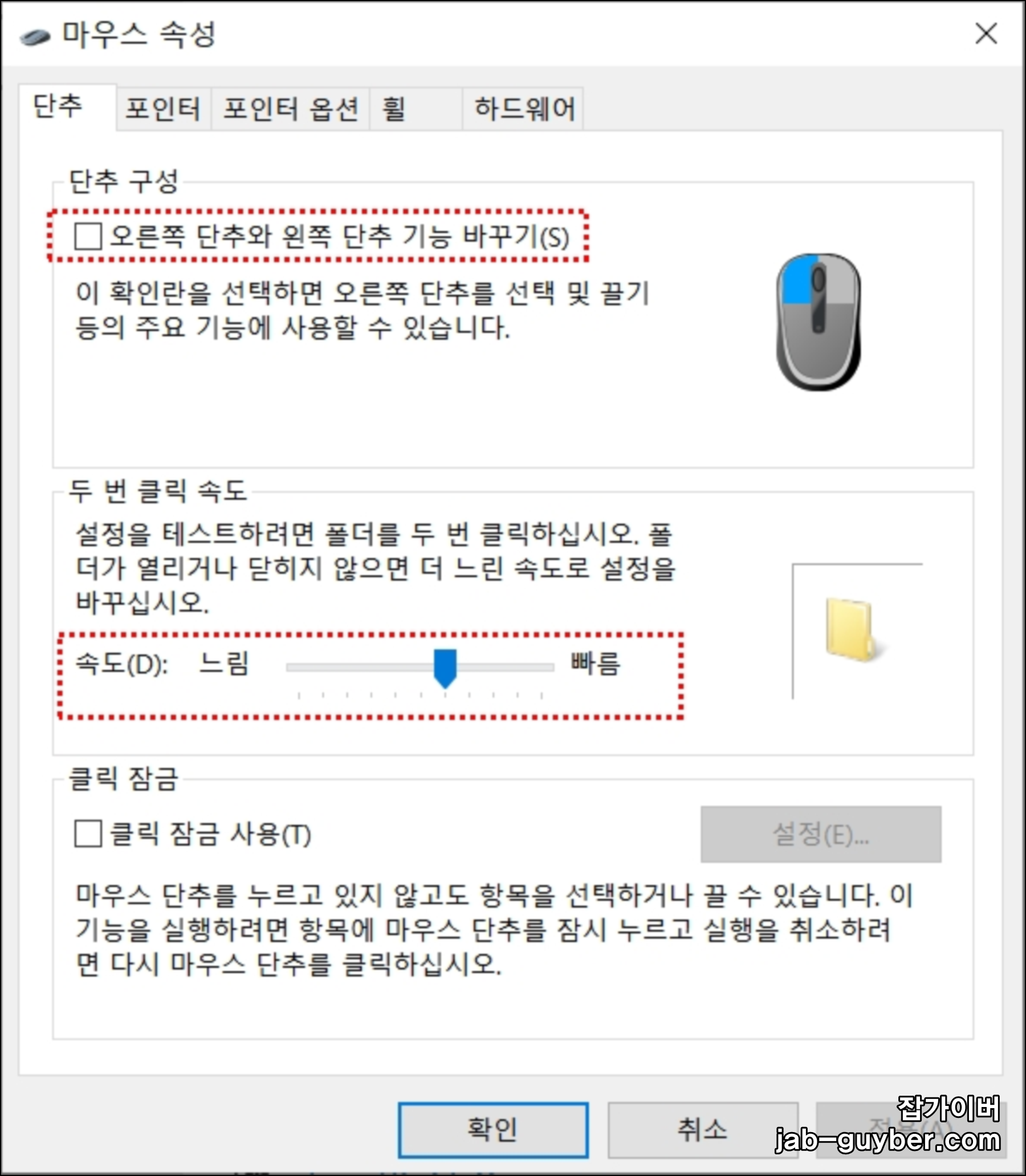 클릭을 왼쪽 오른쪽 변경 및 두 번 클릭 시 반응속도를 빠르거나 느리게 설정할 수 있습니다.