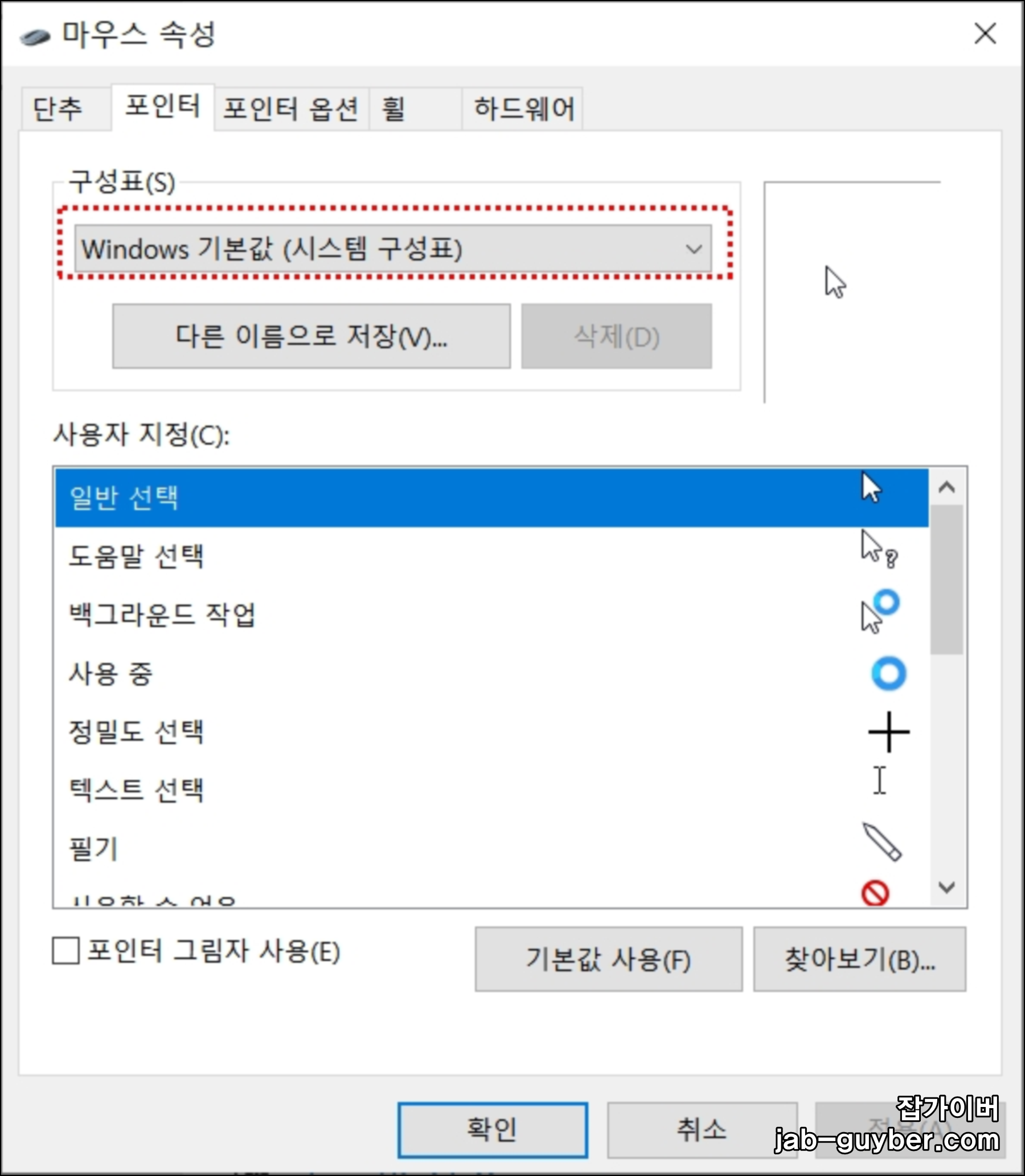 포인터에서는 기본적으로 윈도우에서 제공하는 구성표 외에도 추가로 원하는 마우스 포인트로 변경할 수 있습니다.