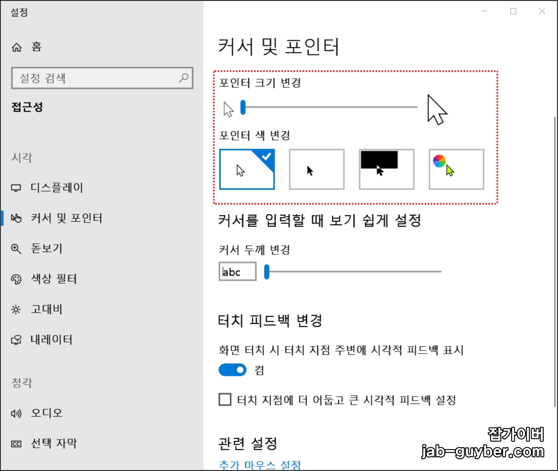 윈도우10 마우스 포인터 변경 커서 색상 및 왼손 오른손 설정