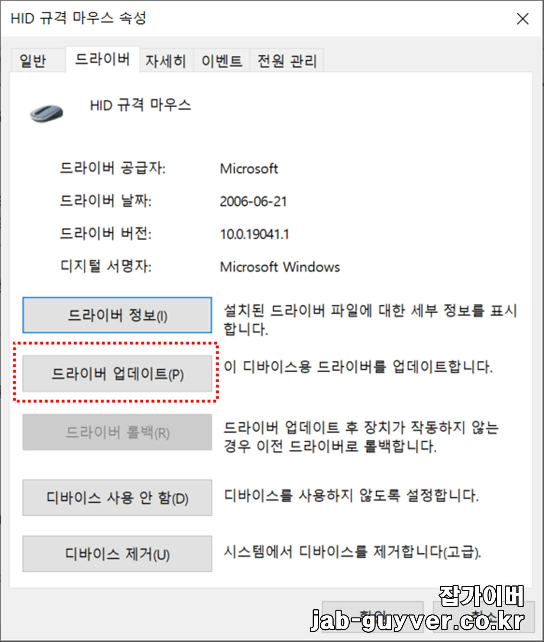 | 마우스 드라이버 업데이트 | 1. "장치 관리자"에서 마우스 디바이스 우클릭 2. "드라이버 업데이트" 선택 |