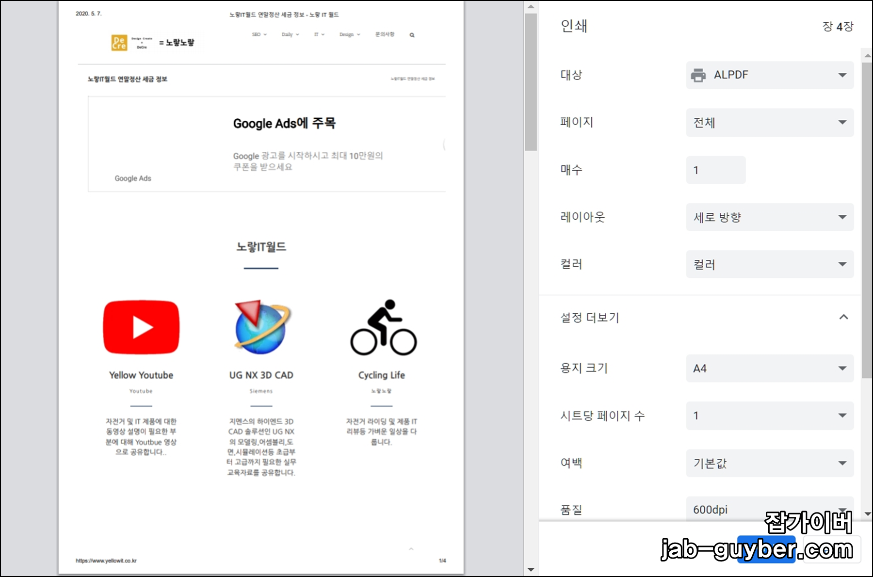 하지만 이 방법을 사용하기 위해서는 프로그램을 추가 설치해야 하는 불편함도 있고 간혹 긴 페이지의 경우 중간에 단이 끊어지는 문제가 발생하는 경우가 있기 때문에 알캡쳐를 이용한 JPG 저장보다는 "프린터 설정"을 통한 PDF 파일로 저장하는 방법을 추천합니다.
