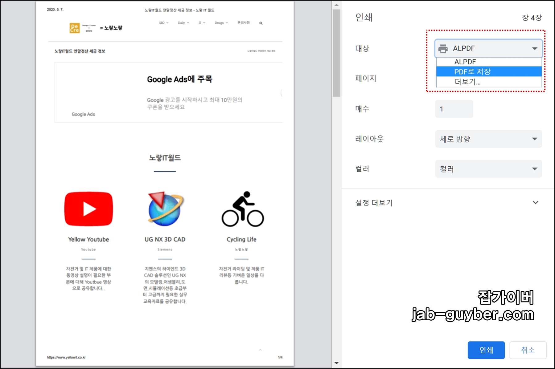 이때 저장하고 싶은 웹페이지의 부분을 페이지나 세로, 가로방향, 크기, 커러, 흑백, 품질, 여백 등의 수정이 필요하다면 변경합니다.