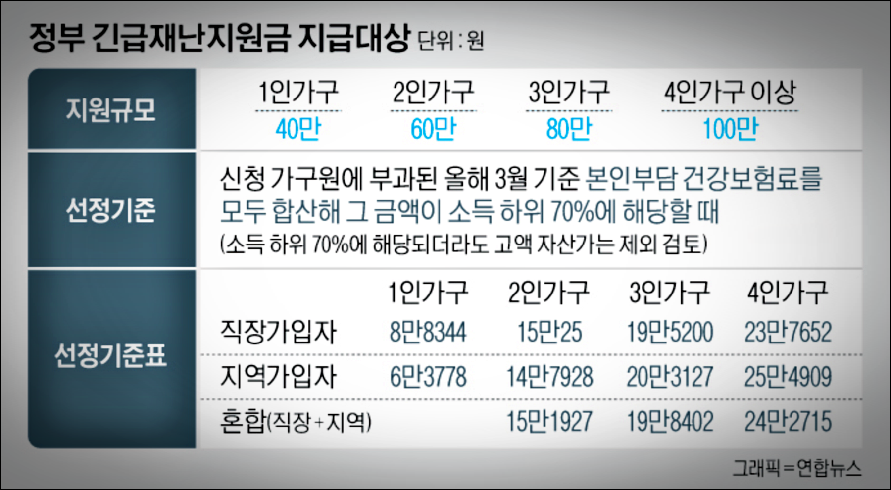 코로나19 긴급재난지원금 소득하위 70% 100만원 지급 결정