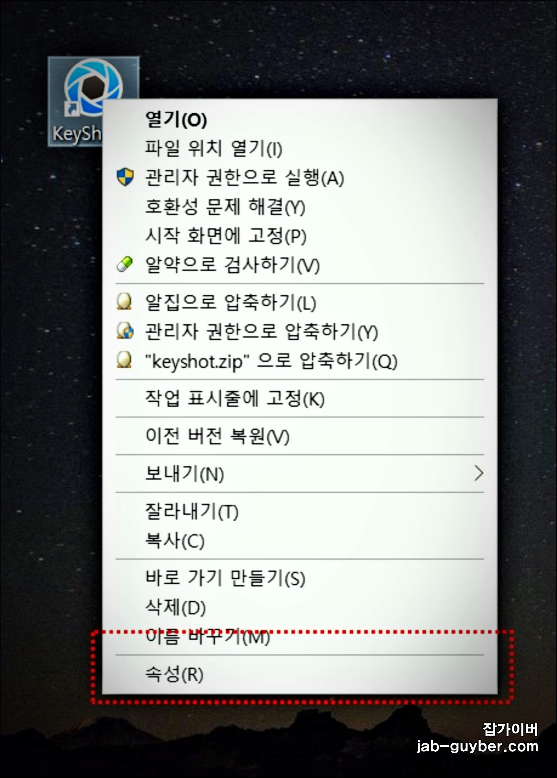 키샷이 설치된 경로로 이동하기 위해서 바탕화면에 생성된 keyshot9 아이콘을 마우스 우클릭 "속성"을 선택 후 "파일 위치 열기"를 선택합니다.