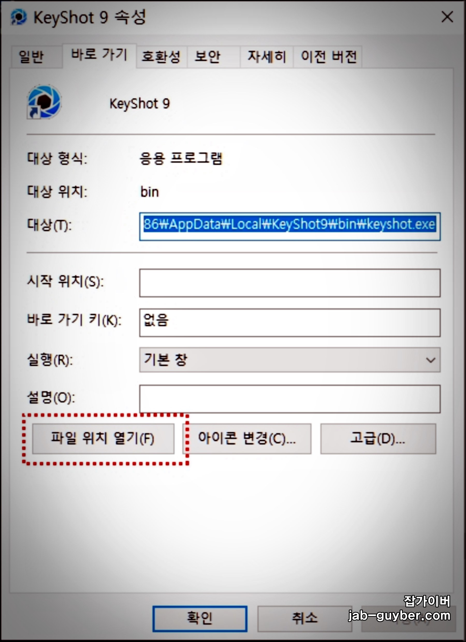 키샷이 설치된 경로로 이동하기 위해서 바탕화면에 생성된 keyshot9 아이콘을 마우스 우클릭 "속성"을 선택 후 "파일 위치 열기"를 선택합니다.