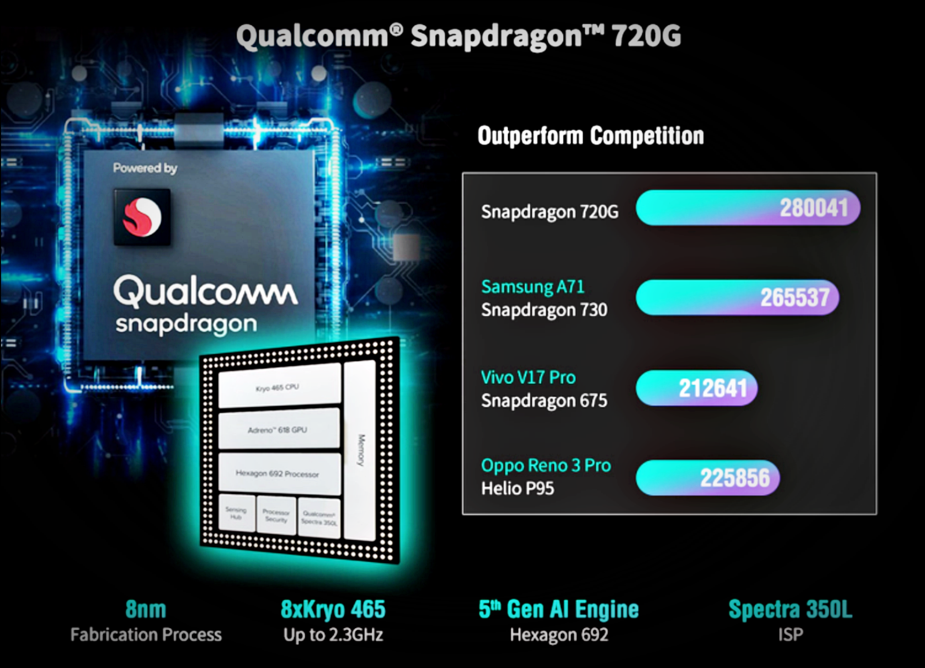 스냅드래건 720G 모델은 삼성의 A71에 탑재된 스냅드래곤 730보다도 벤치마크 점수 측면에서는 더 높게 나오는 제품으로 대략 벤츠마크 점수로는 1,500,000점 정도 높은 8 나노 공정의 AP 제품입니다.