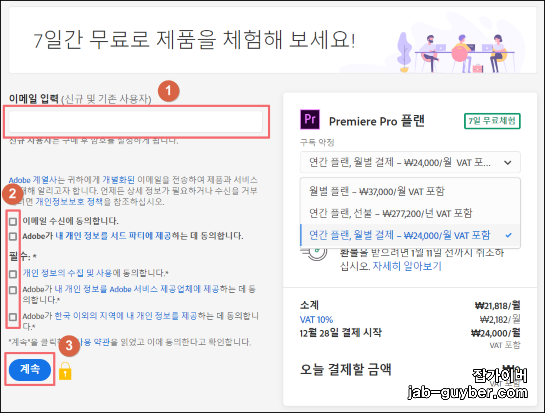 무료 체험판을 사용하기 위해서는 연간 플랜을 미리 선택해야 합니다.