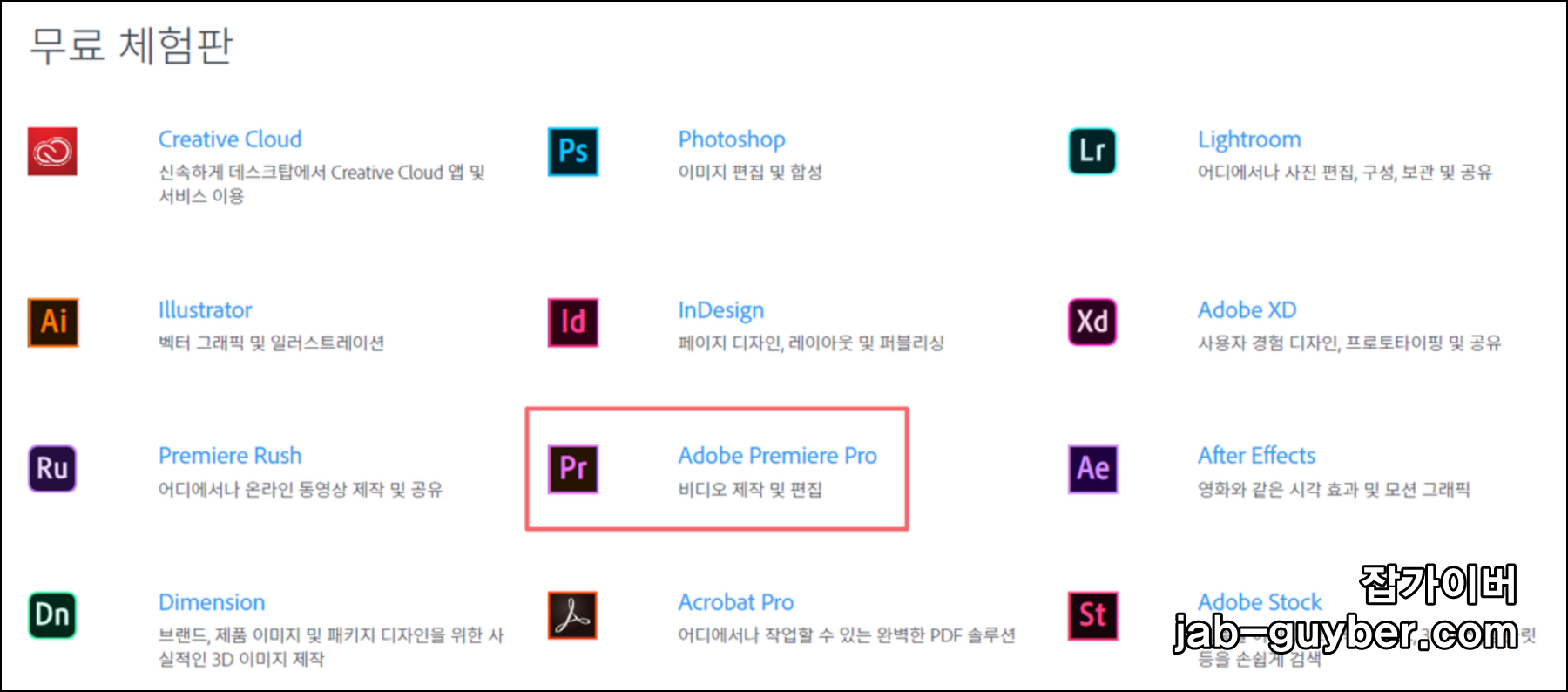 그럼 무료체험판으로 제공하는 Adobe Creative Cloud를 종류별로 다운로드할 수 있습니다.