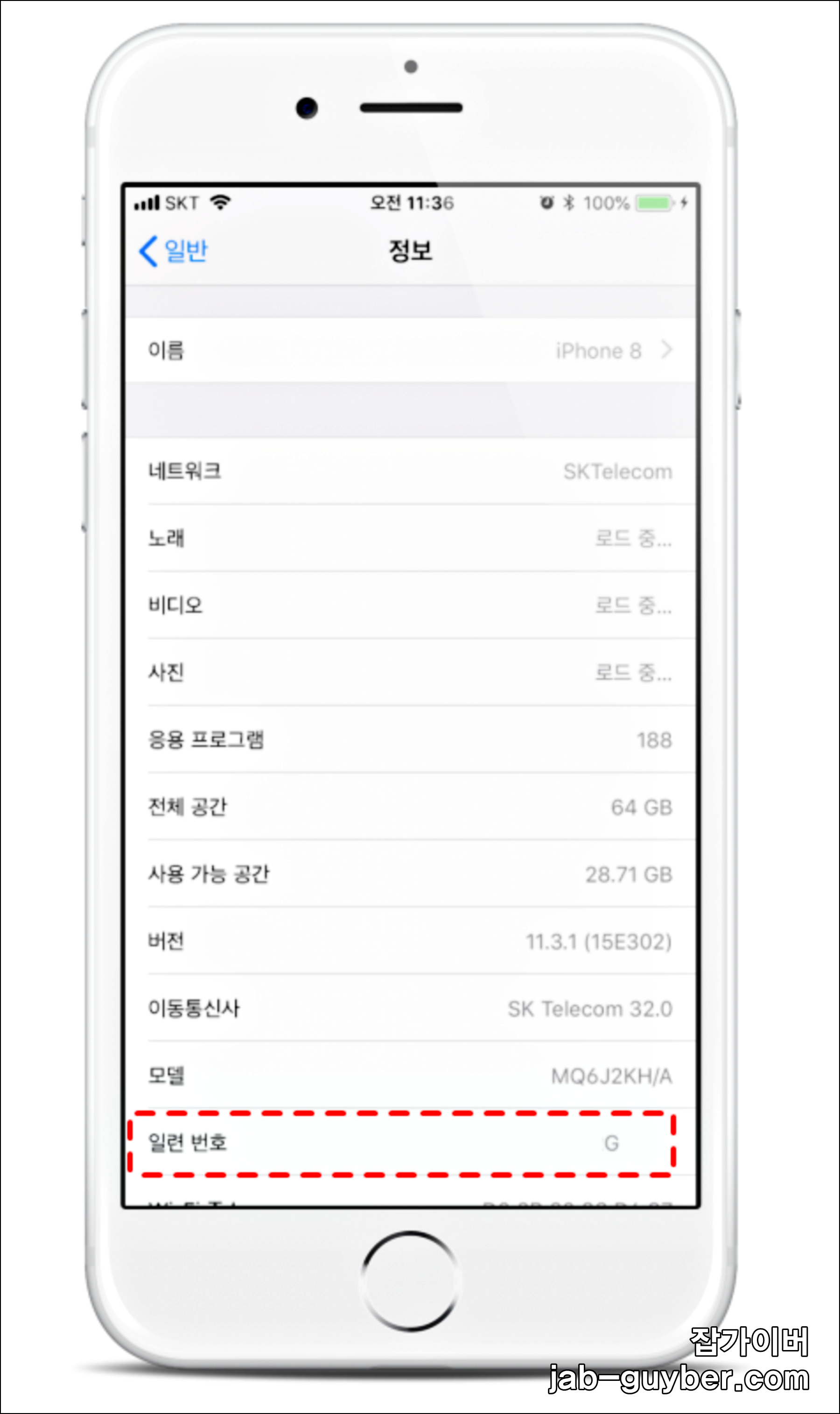 일반 -> 정보 -> 일련번호를 확인할 수 있습니다.