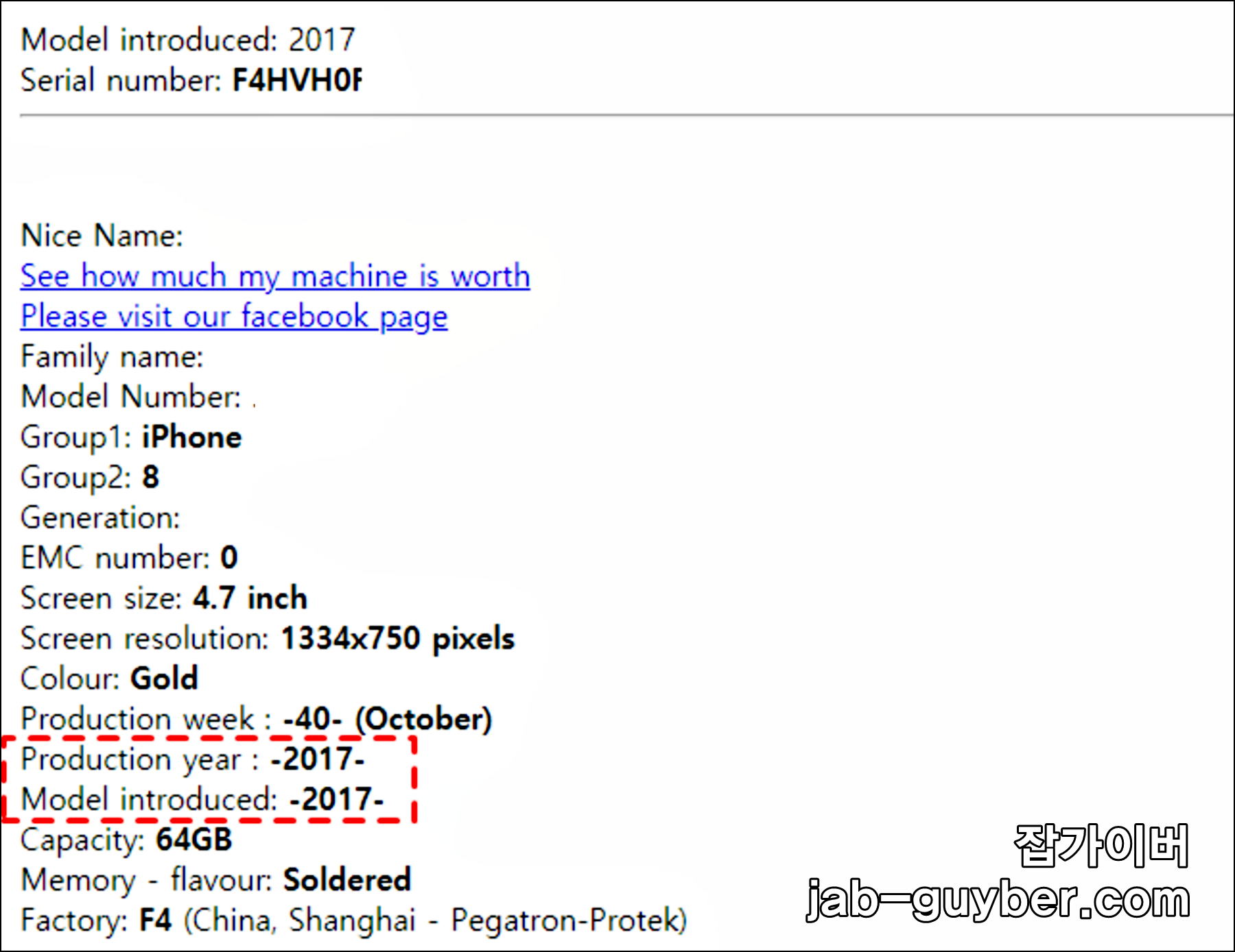 이 사이트에 아이폰의 일련번호를 입력하면 아이폰의 모델 번호, 스크린 사이즈, 해상도, 색상뿐만 아니라 생산 연도와 주차(Production year, Production week) 정보를 확인할 수 있습니다.