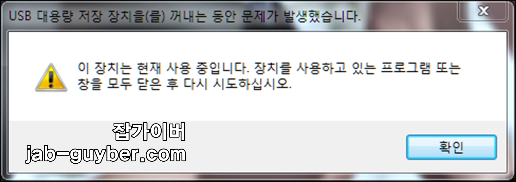 이 장치는 현재 사용 중입니다. 장치를 사용하고 있는 프로그램 또는 창을 모두 닫은 후 다시 시도하십시오 .라고 표시가 됩니다.