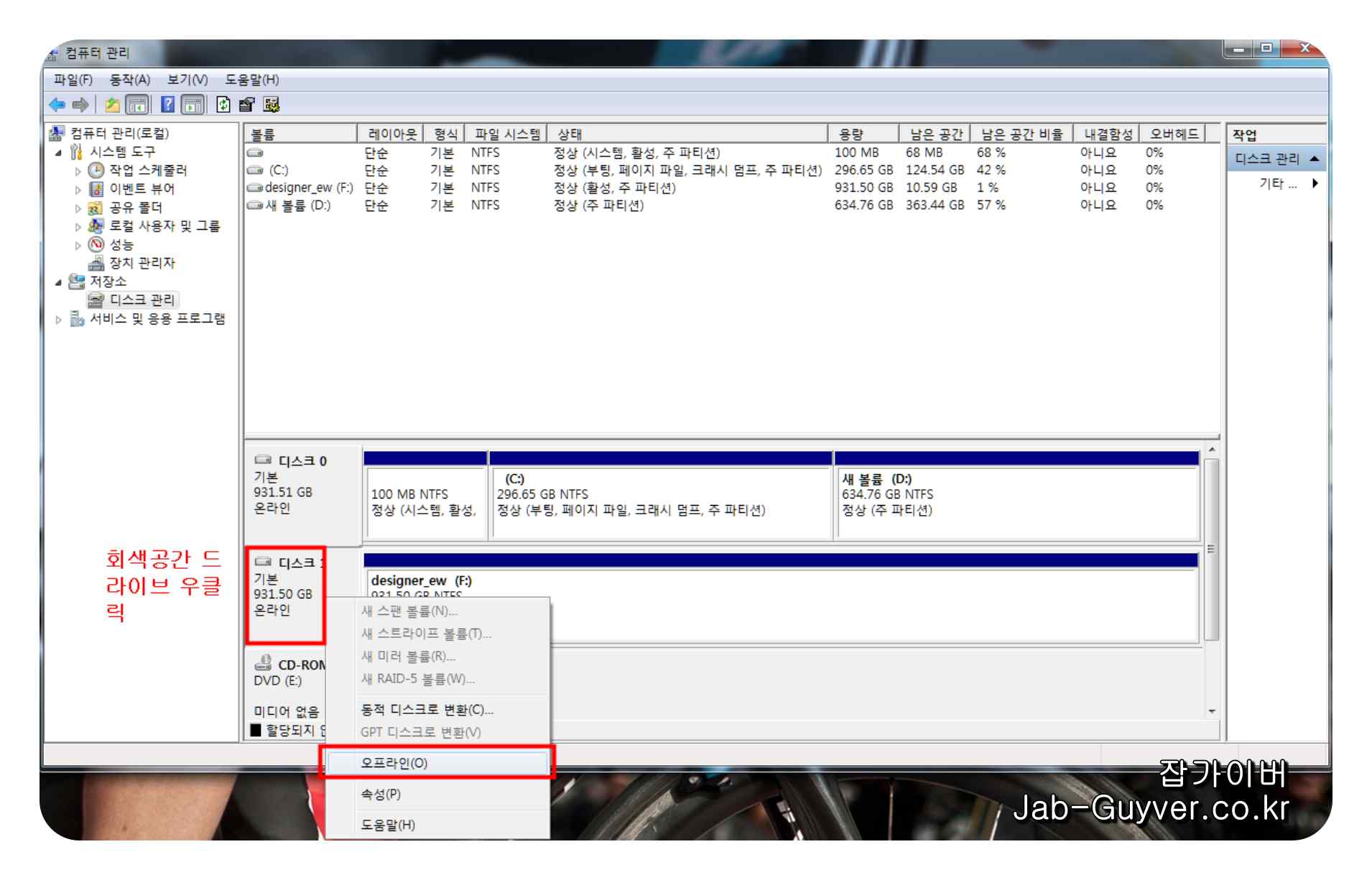 이렇게 해도 제대로 안전제거가 되지 않느다면 파티션설정에서 외장하드 파티션의 연결을 온라인에서 오프라인으로 변경하여 연결을 강제로 끊고 제거하는 방법이 있습니다.