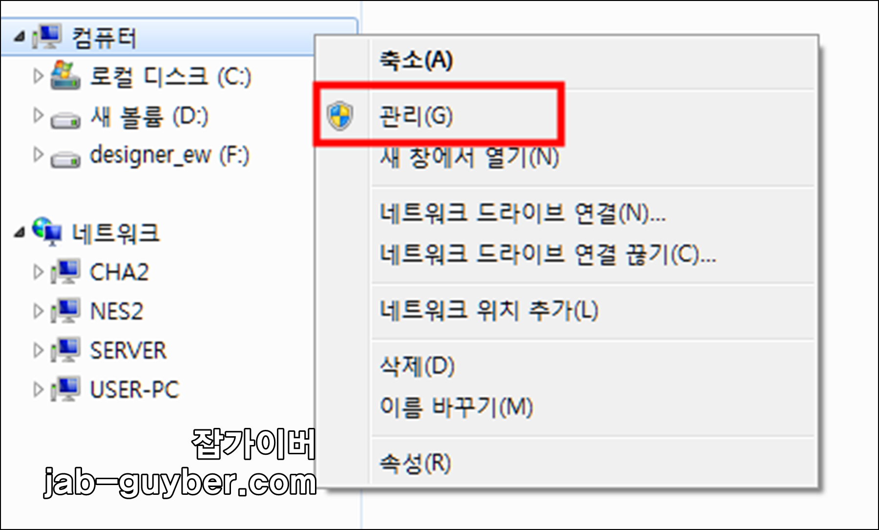 컴퓨터 -> 관리를 선택합니다.