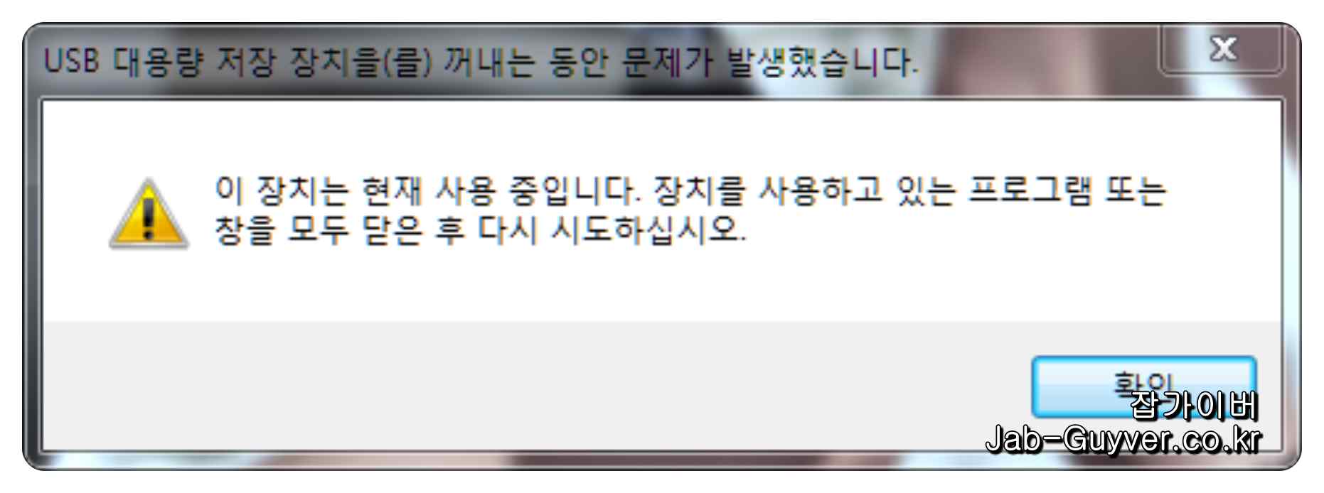이 장치는 현재 사용 중입니다. 장치를 사용하고 있는 프로그램 또는 창을 모두 닫은 후 다시 시도하십시오 .라고 표시가 됩니다.