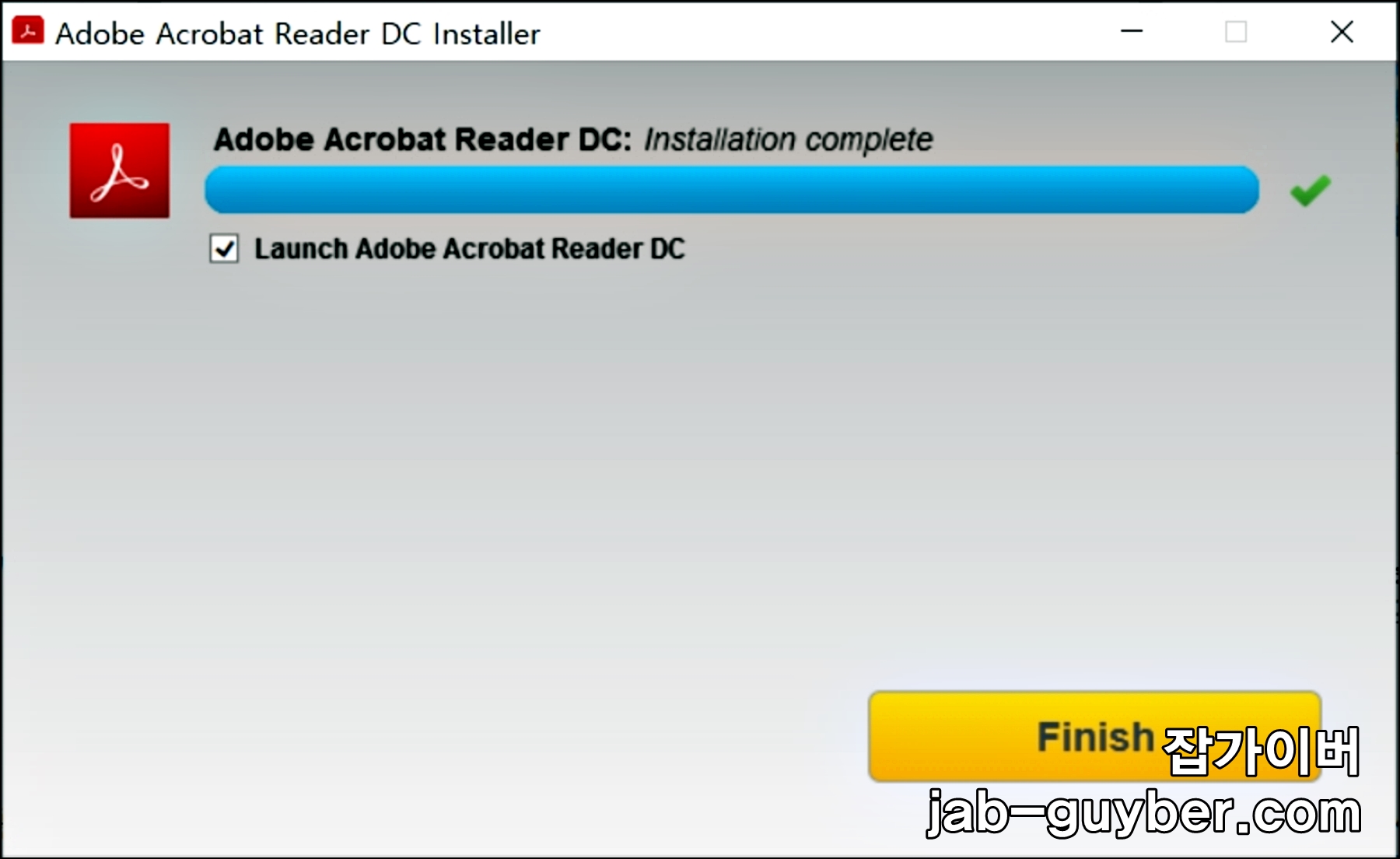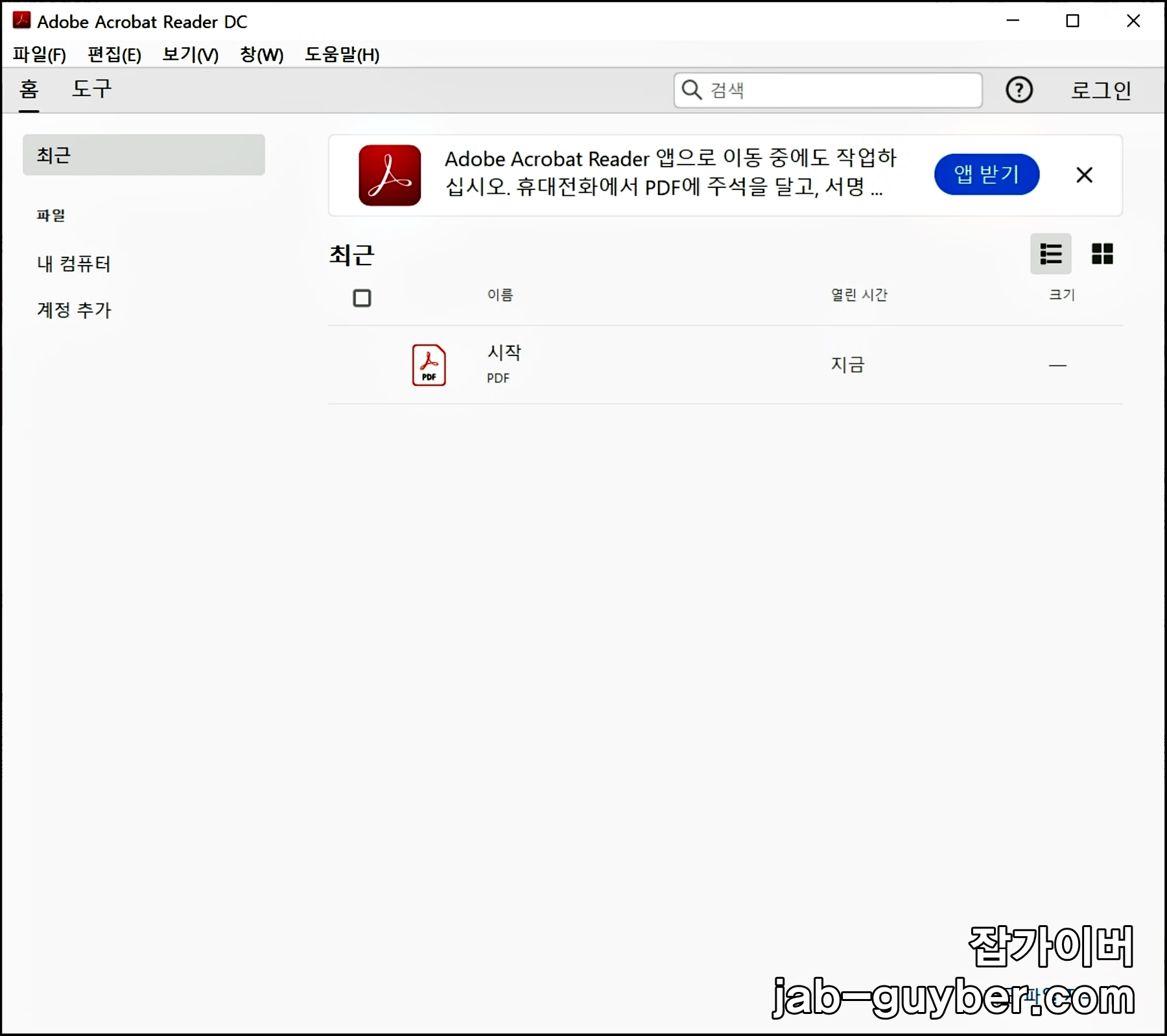 설치가 완료되었다면 기본적인 뷰어 기능이 가능하며 그 외에 주석이나 편집, 보호를 위한 암호설정 등을 위해서는 아크로뱃 프로로 업그레이드해야 합니다.