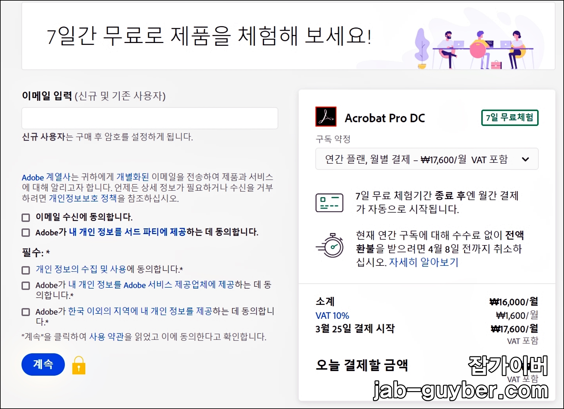 업그레이드 시 매월 17,600원을 결제해야 하며 아크로뱃 프로버전도 무료로 체험가능한 버전으로 다운로드할 수 있습니다.