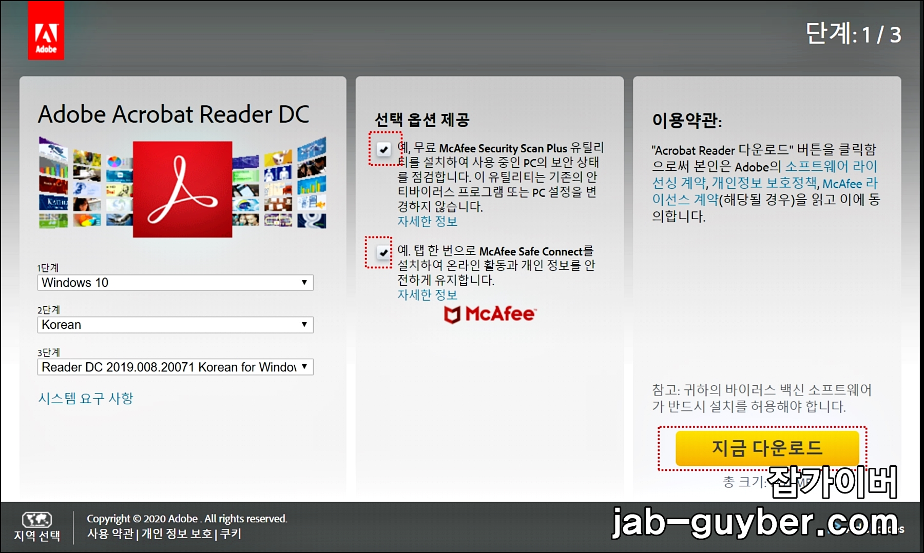 모든 설정이 완료되었다면 선 탭 옵션에 존재하는 McAfee Security Scan Plus와 McAfee Safe Connect를 설치하기를 추천하지만 해당 프로그램을 사용하기 위해서는 결국은 결제를 해야 하기 때문에 설치를 하지 않느것을 추천합니다.