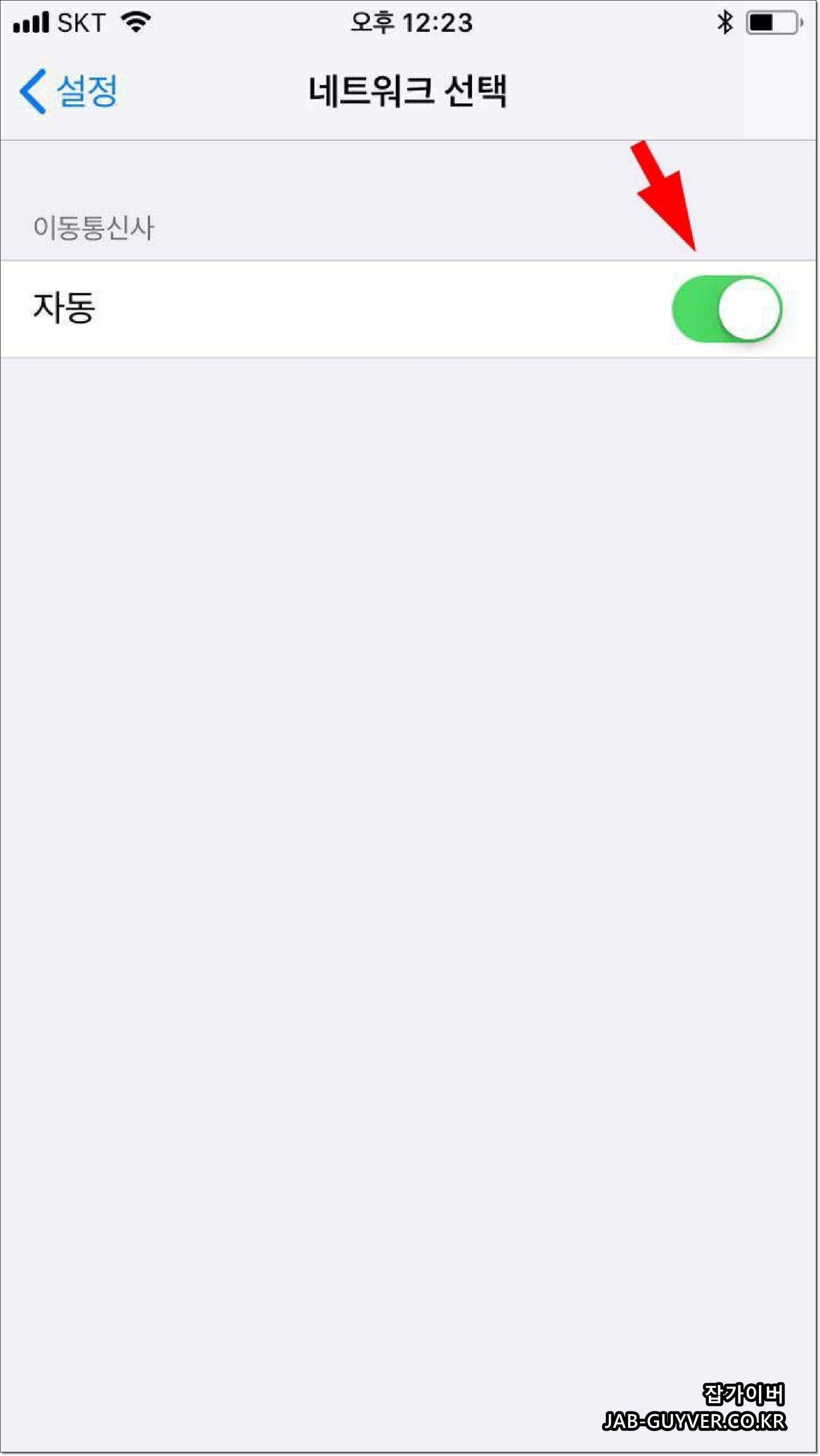이동통신사 설정에서도 수동이 아닌 자동으로 체크되어 있는지 확인합니다.