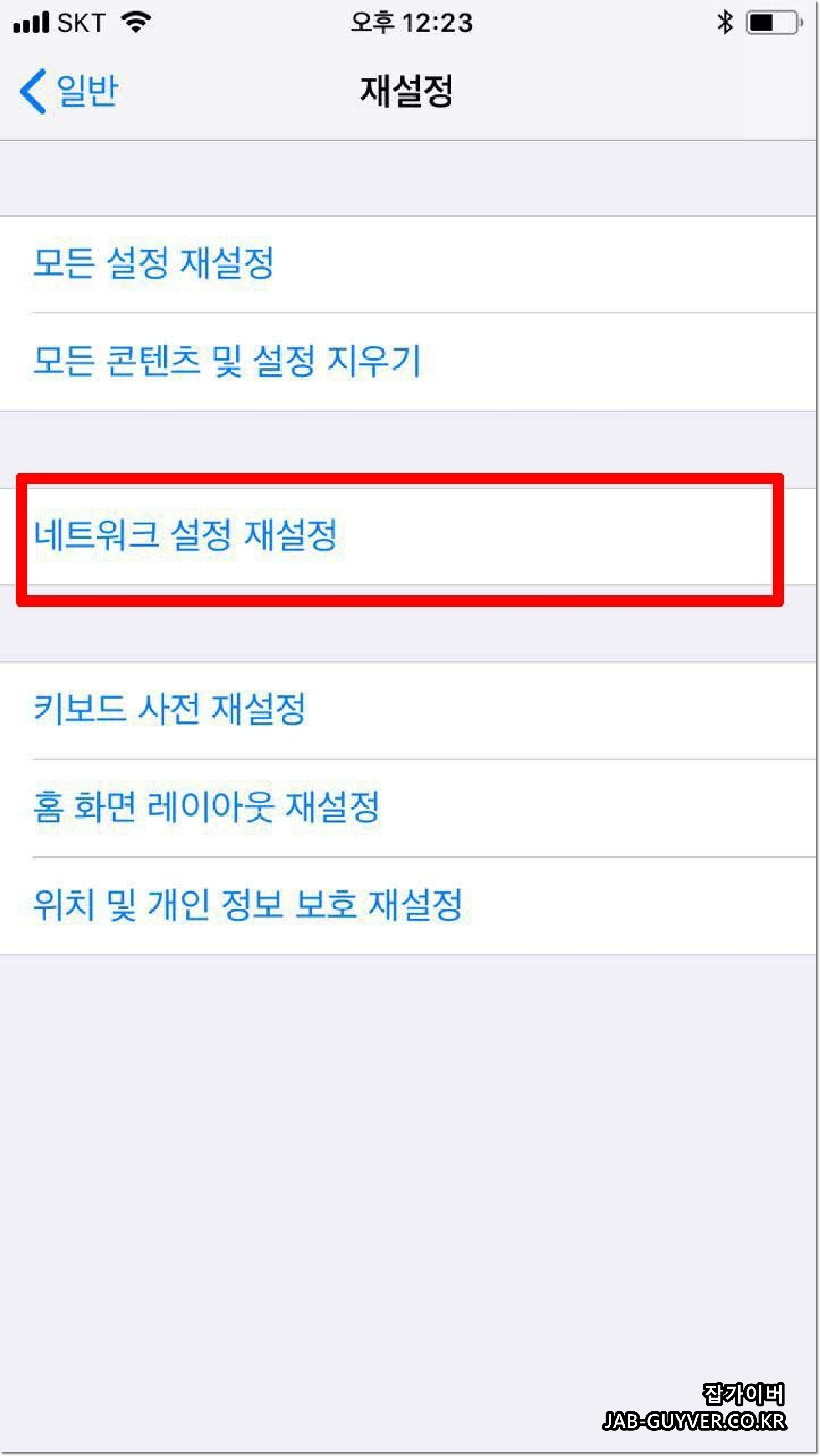 그래도 제대로 문제가 해결되지 않늗나면 "아이폰설정->일반->재설정->네트워크 설정"을 재설정 후 실행합니다.