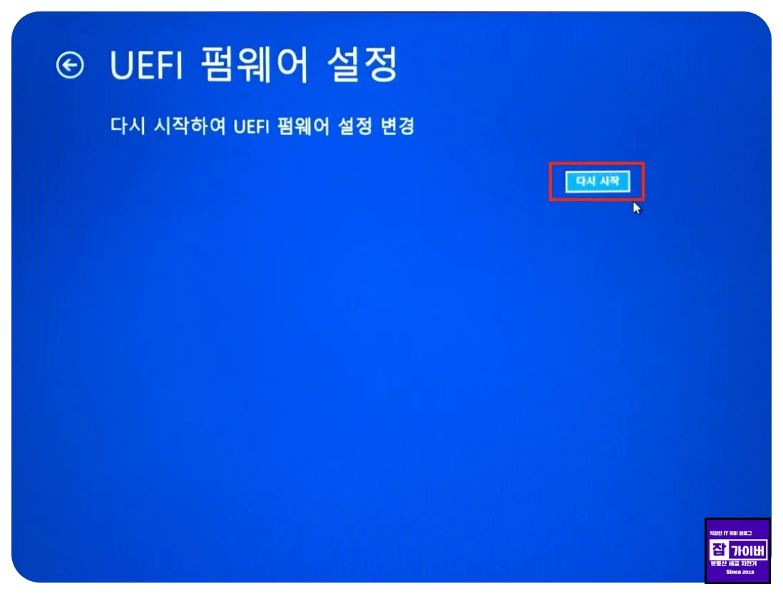 마지막으로 다시 시작을 누르면, 윈도우 대신 바이오스 설정 화면으로 바로 들어가게 됩니다.