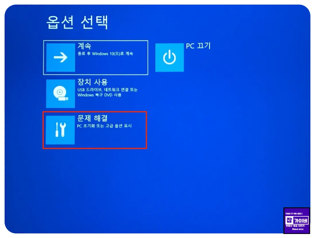 - 복구 메뉴에서 고급 시작 옵션의 다시 시작을 누르면, 재부팅하면서 문제 해결 화면으로 넘어갑니다.