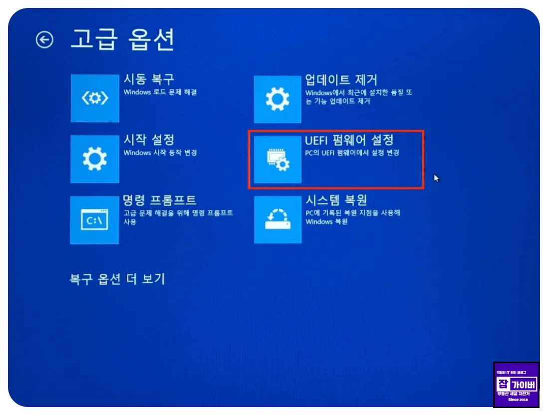 - 문제 해결 → 고급 옵션 → UEFI 펌웨어 설정 → 다시 시작 순으로 들어갑니다.