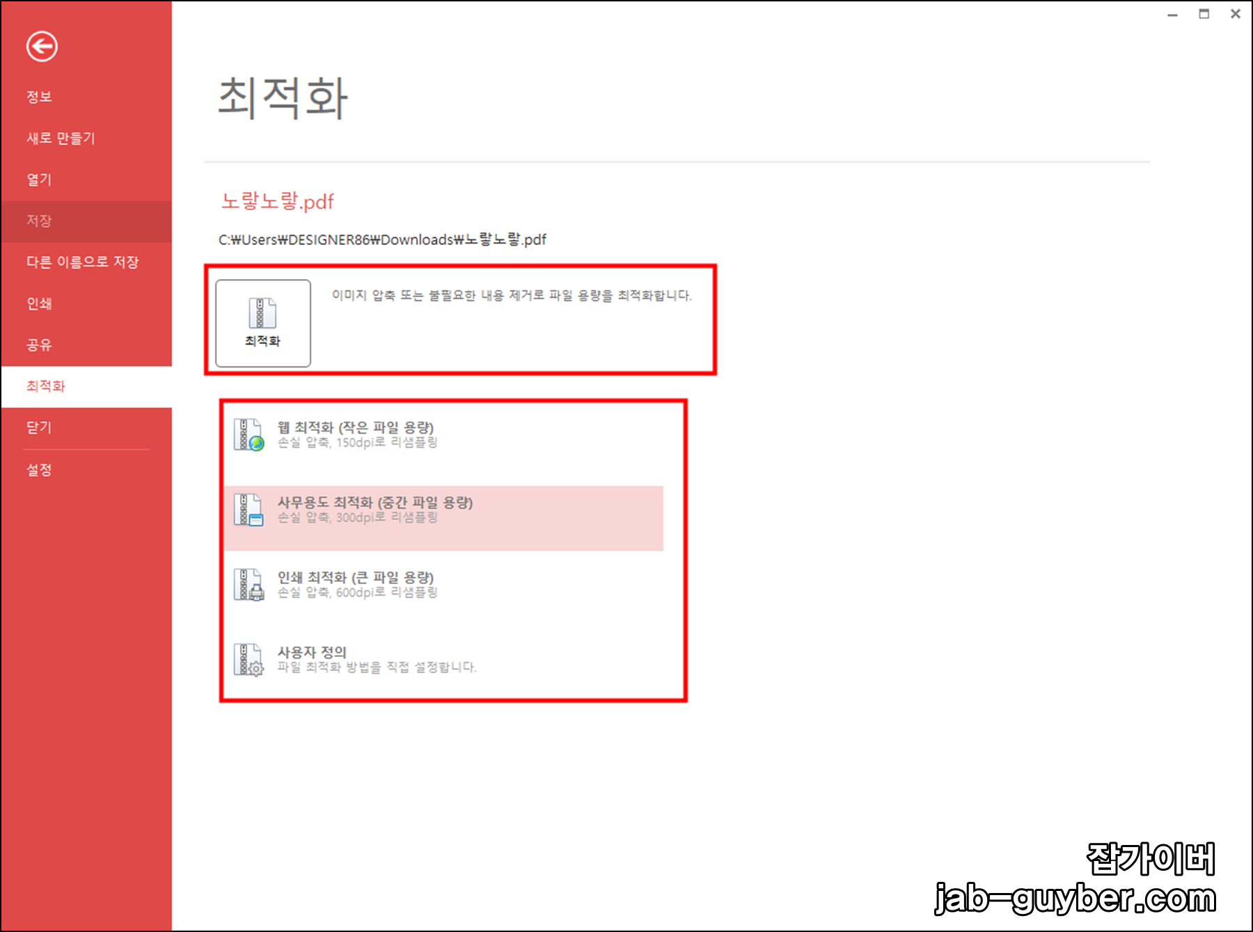 차이점이라면 PDF 파일을 압축 수준을 정할 수 있다는 점입니다.