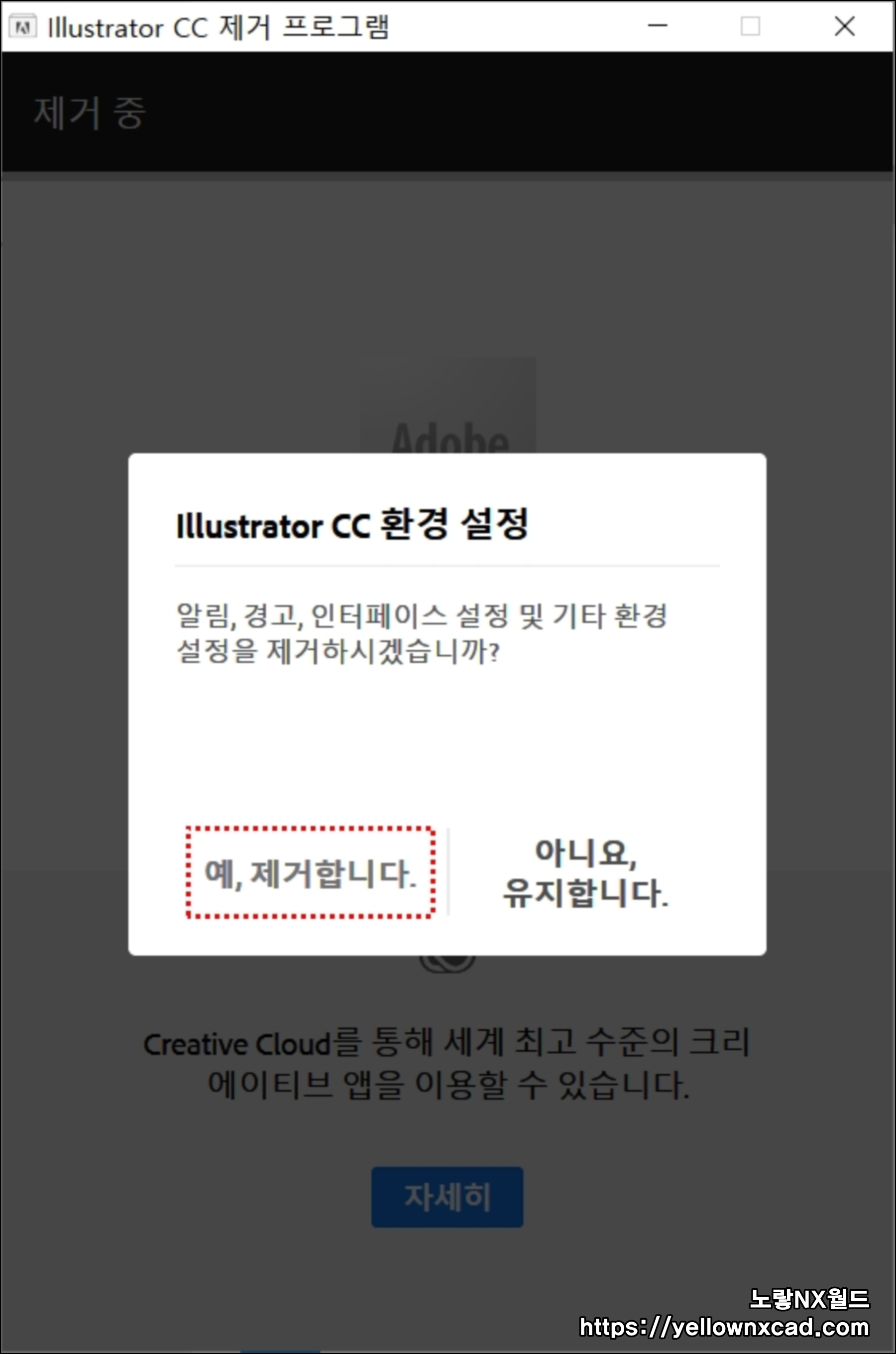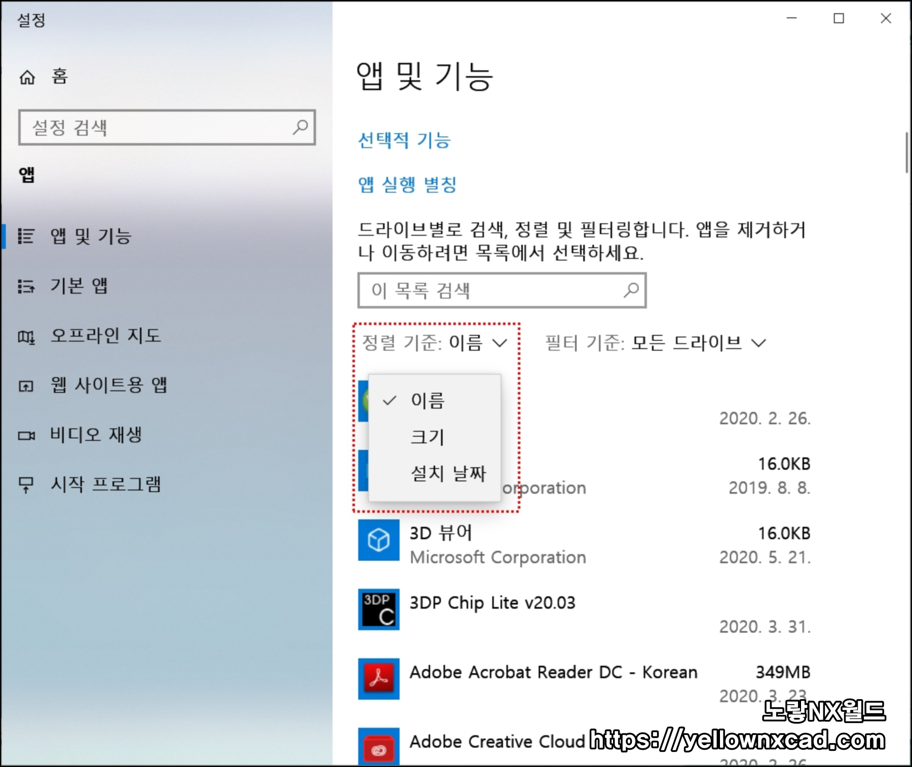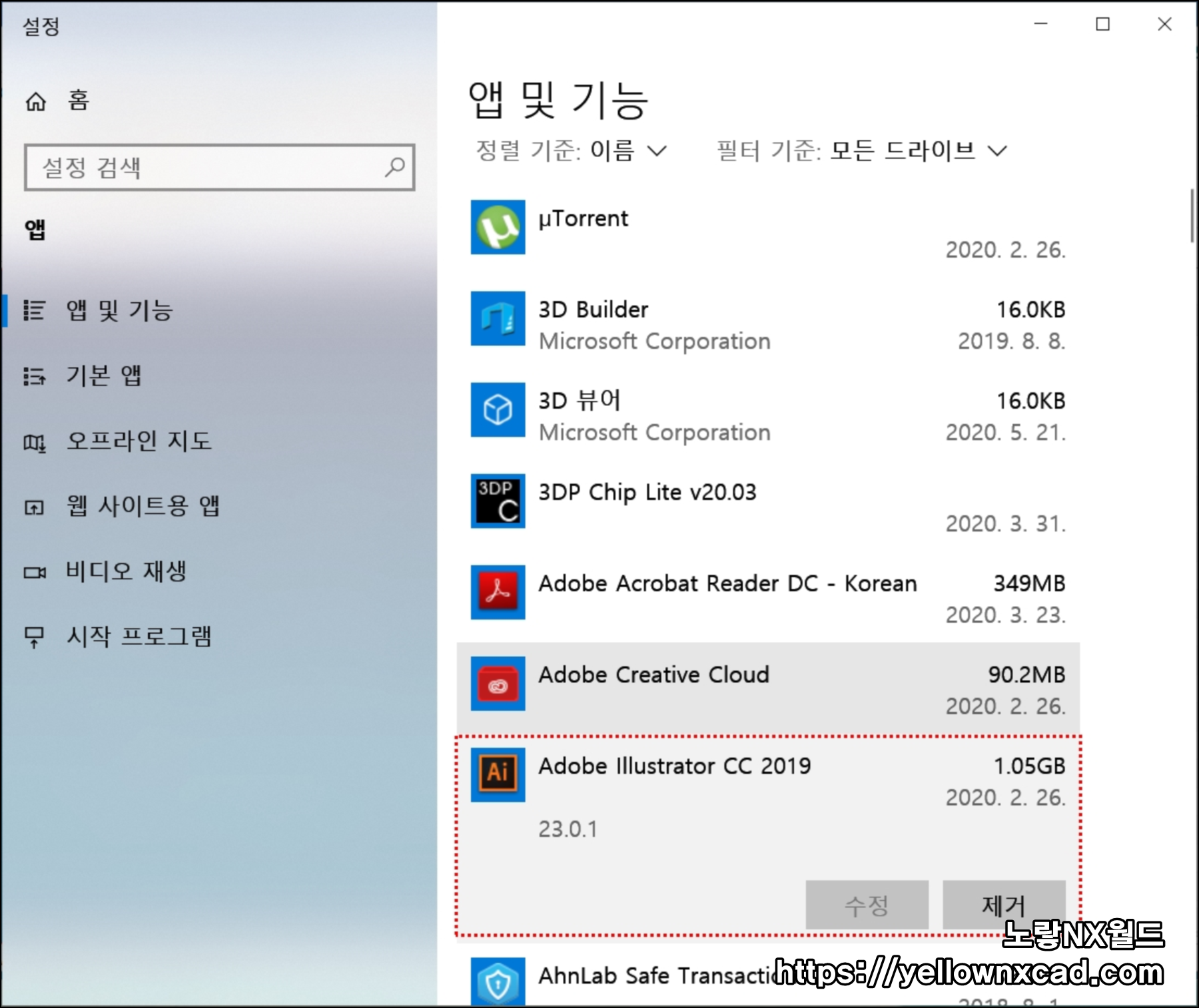 이름이나 크기,설치날짜순으로 볼 수 있으며 여기서 예를 들기 위해 "일러스트 CC 2019"를 삭제하기 위해 선택합니다.