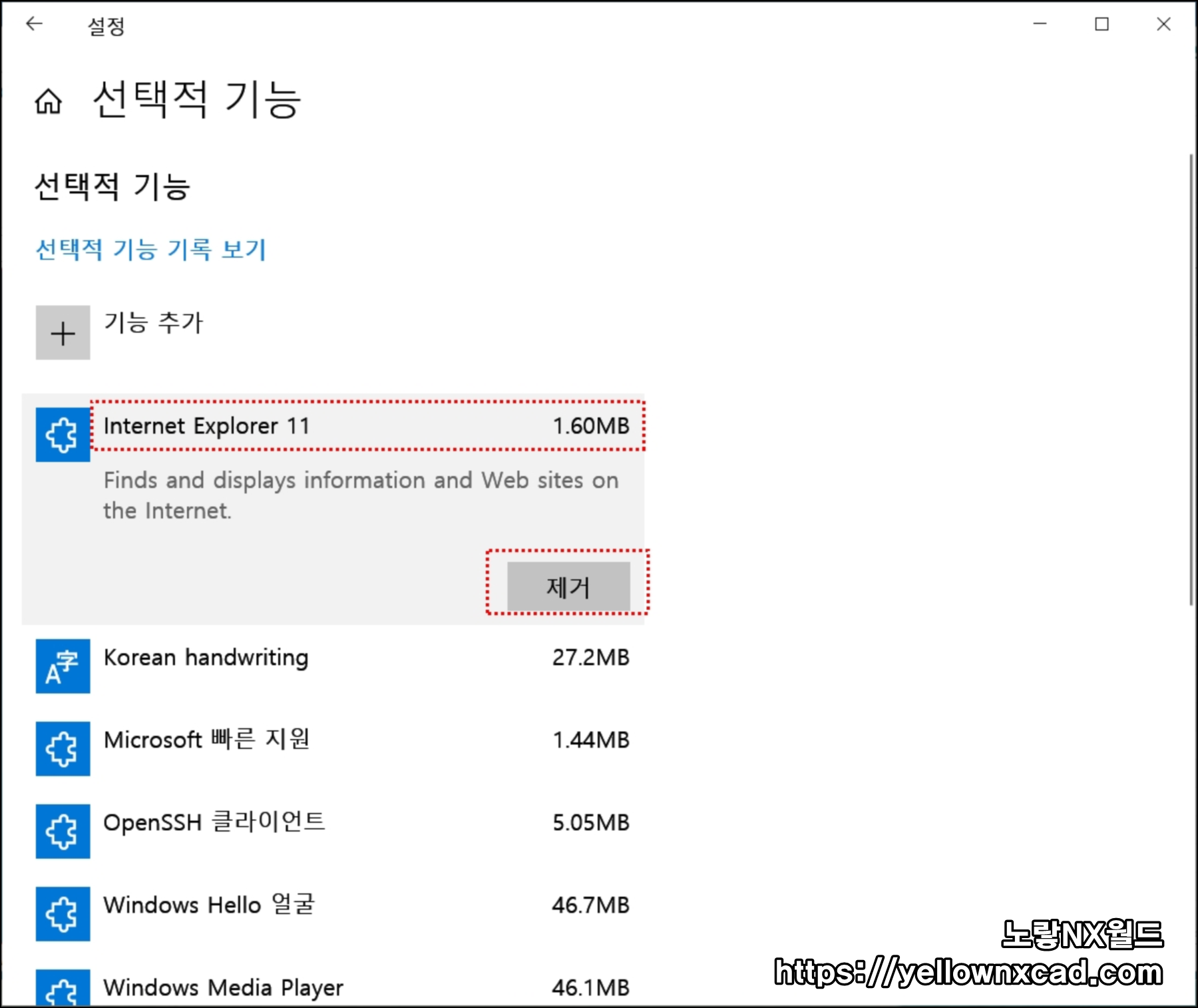 예로는 Internet Explorer 11"인터넷익스플로러"등을 삭제할 수 있습니다.