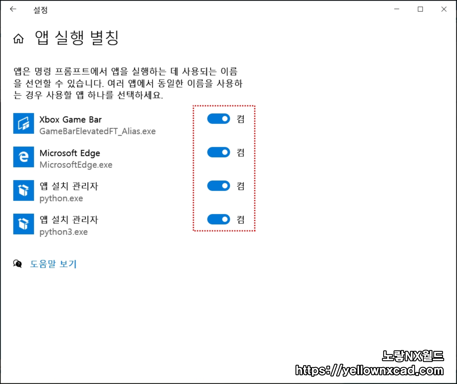 앱실행 별칭을 선택하면 Xbox나 마이크로소프트 앱등 명령 프롬프트에서 앱을 실행하는데 사용되는앱을 활성화 할 수 있습니다.