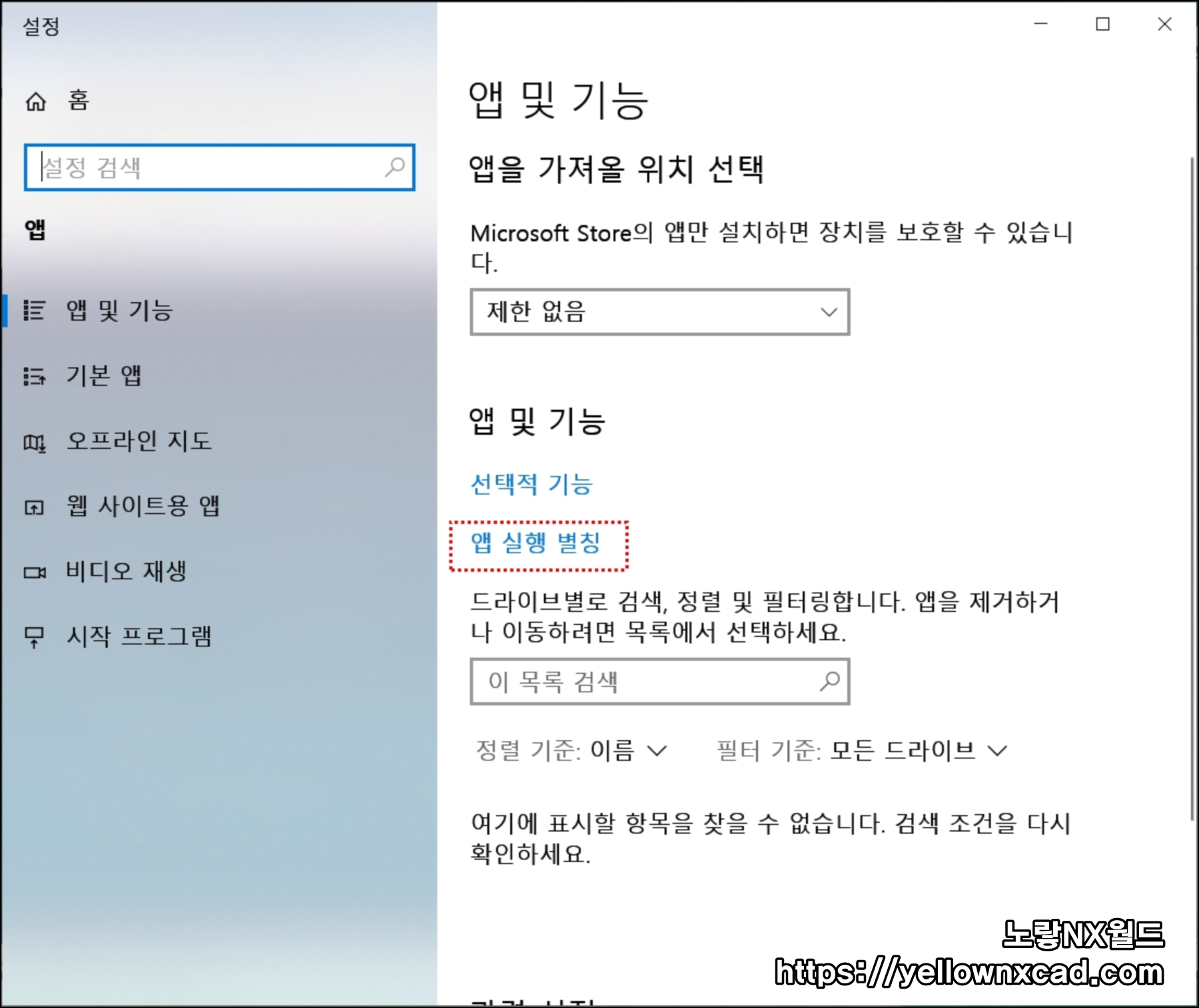 앱 및 기능을 살펴보면 선택적 기능과 앱 실행 별칭 두가지 항목을 볼 수 있습니다.