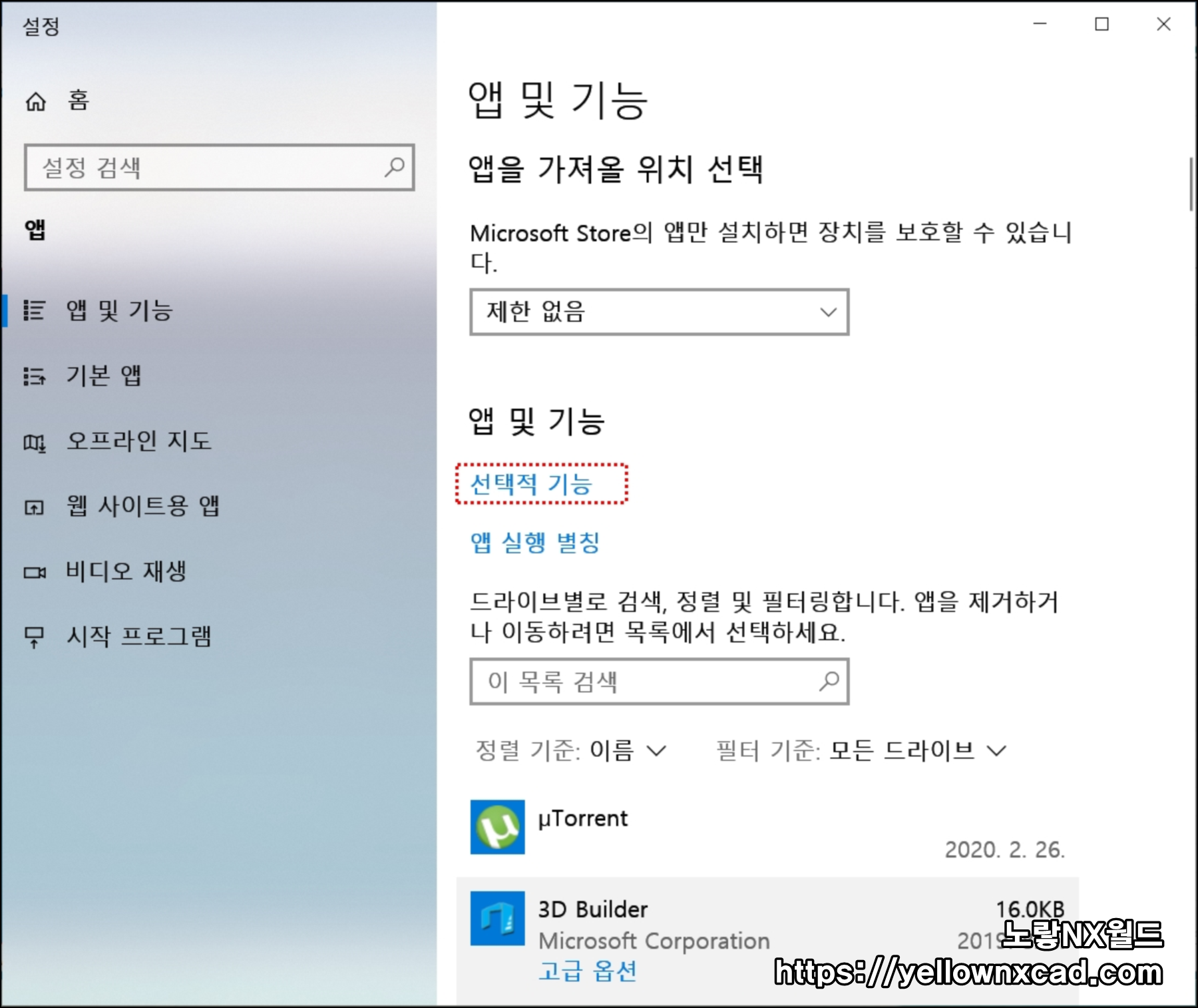 선택적 기능을 선택하면 윈도우10을 설치할때 기본적으로 설치되는 프로그램등을 삭제할 수 있습니다.