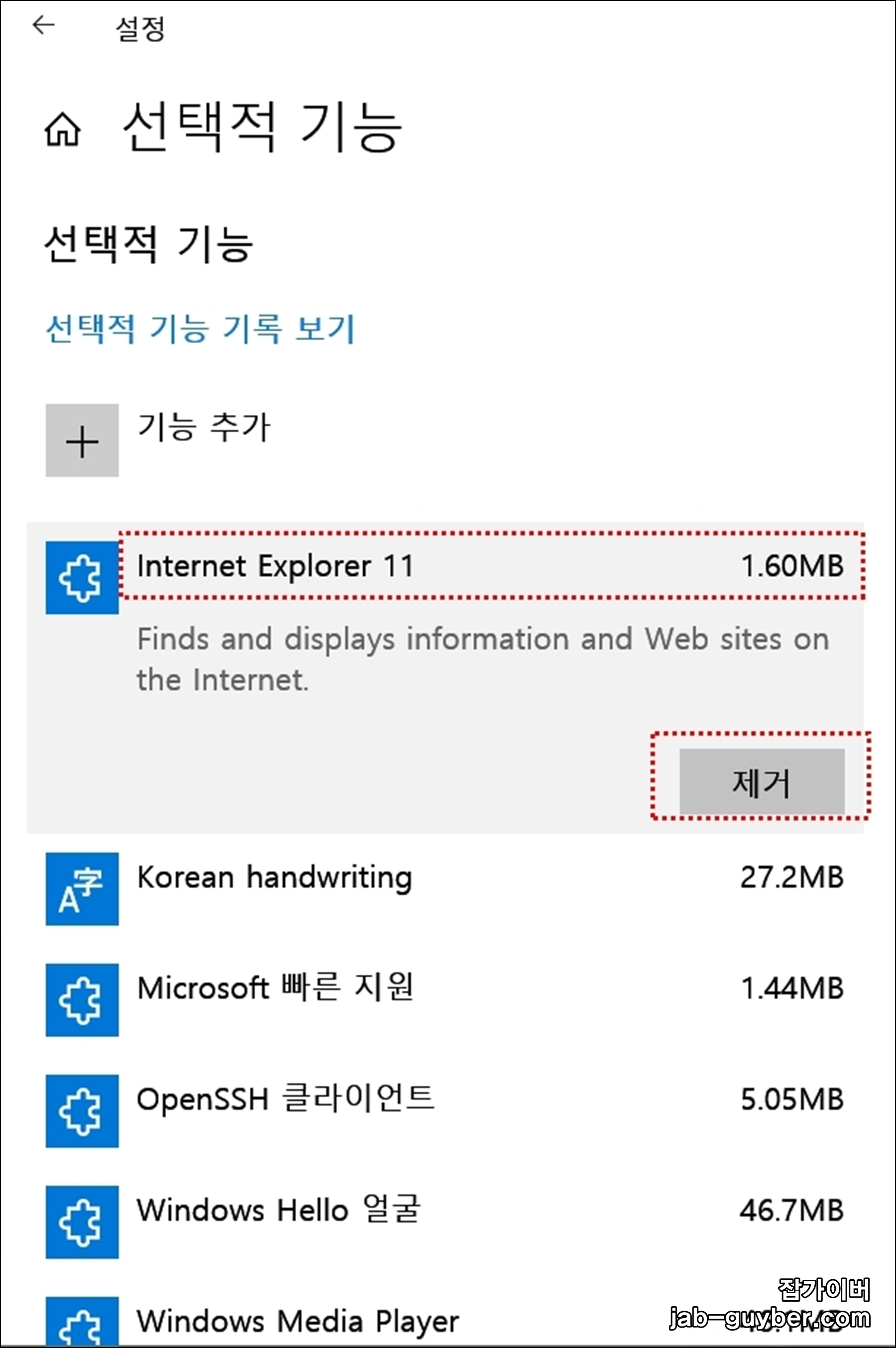윈도우7/8처럼 “앱 및 기능”에서 IE11 제거가 안 보이거나, 목록에 있어도 제거 버튼이 비활성인 경우가 있습니다.